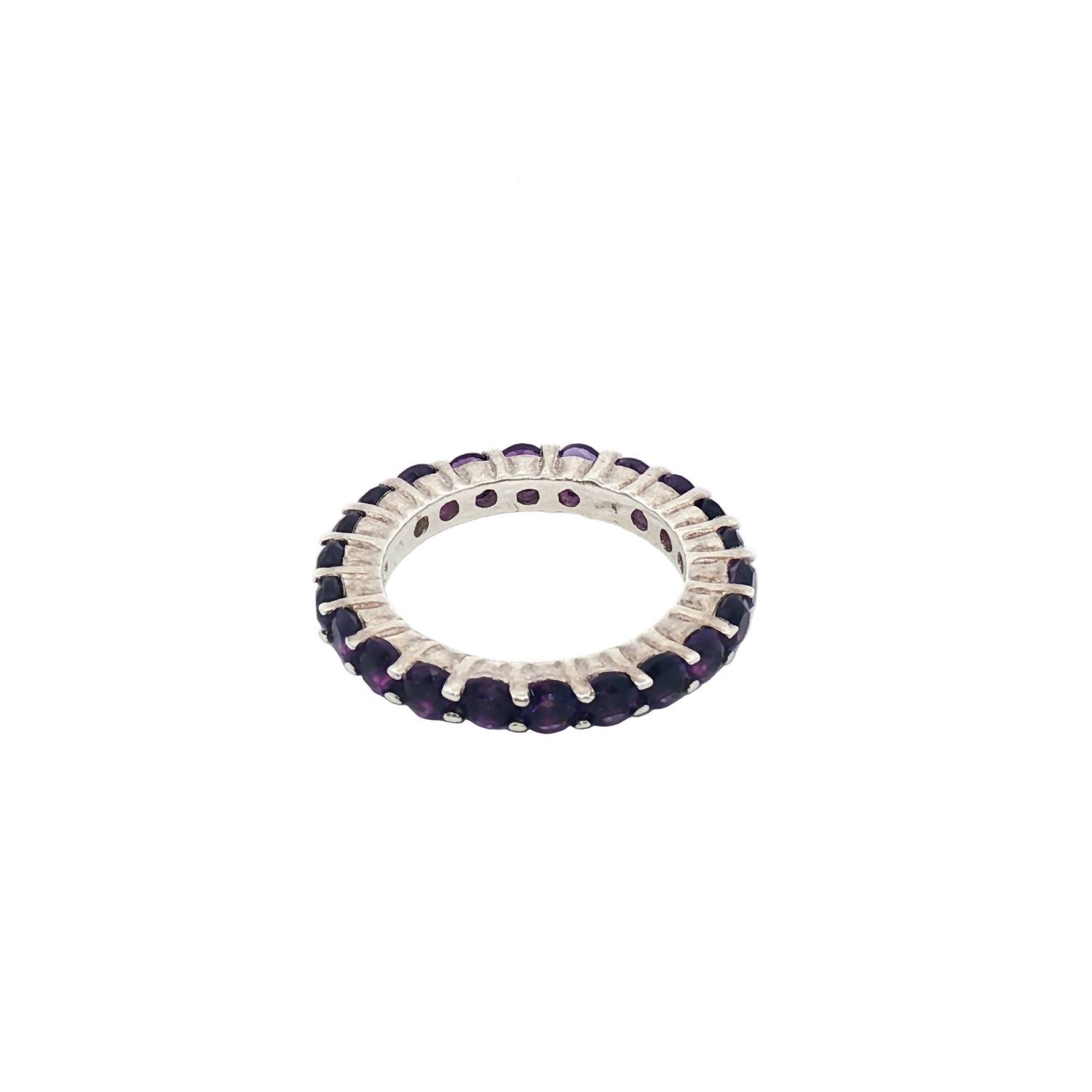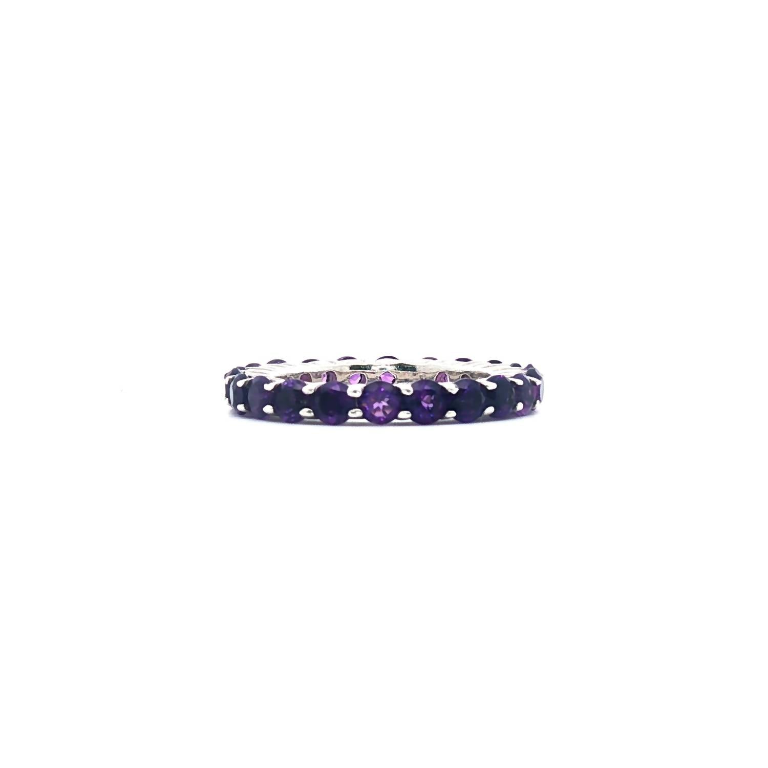 Wear this ring stacked or by itself... you can't go wrong. Elevate your jewelry collection with the Women's Sterling Silver Amethyst Ring from Elazco Inc, featuring stunning purple hues. Crafted from fine sterling silver, this exquisite ring showcases 22 natural round brilliant amethysts with a total carat weight of 1.10. Designed in a lovely purple hue, it embodies the elegance of February's birthstone. This fashionable ring offers a secure fit with its push back clasp, making it a perfect addition for any occasion.