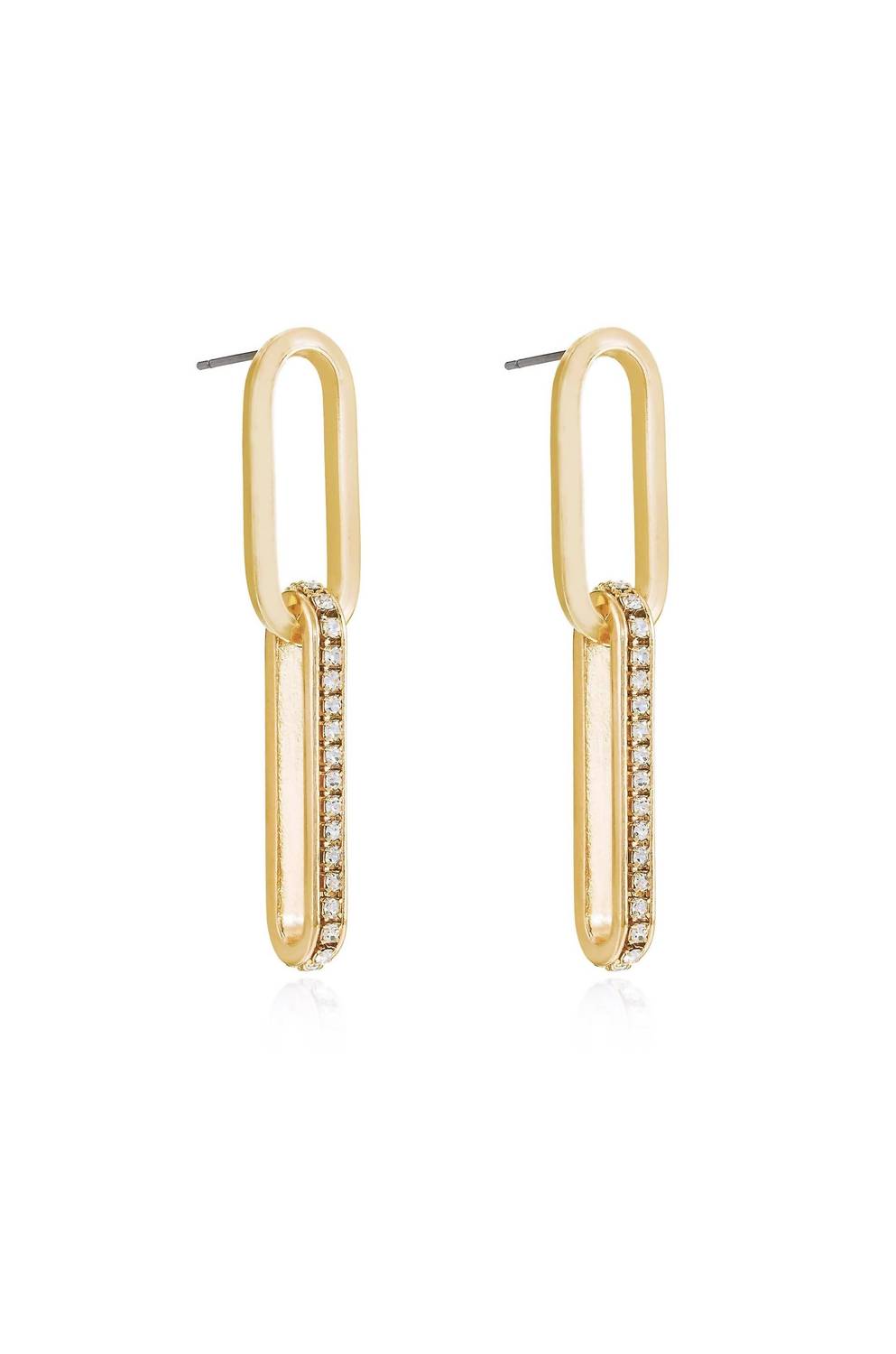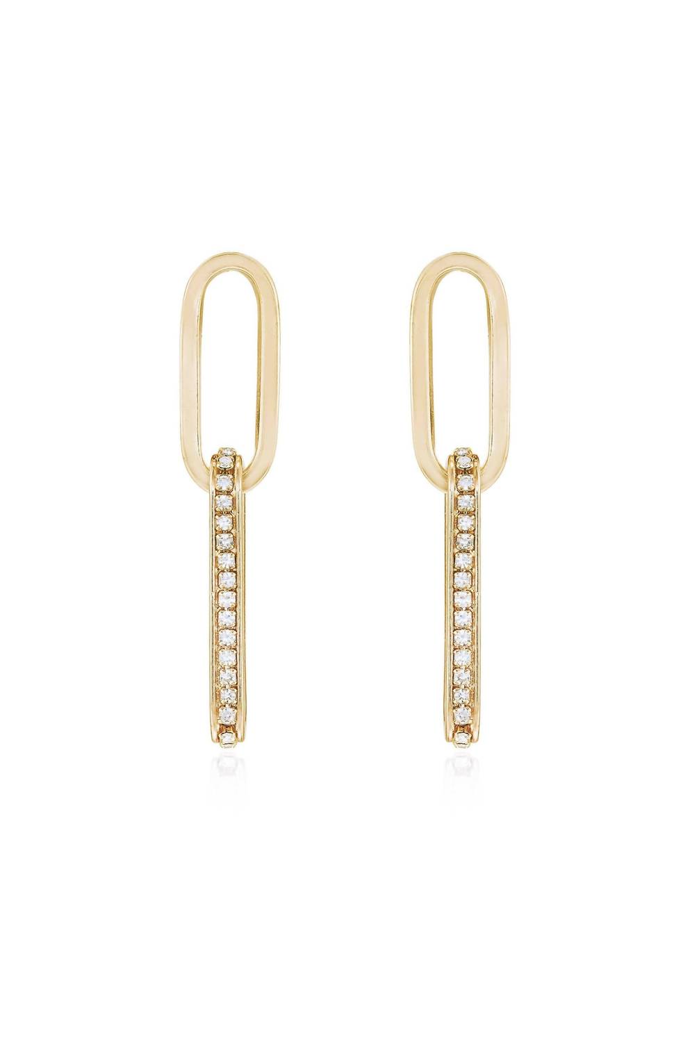 Elevate your style with Ettika's Women's Crystal Link Earrings, an exquisite accessory in a luxurious gold finish. Crafted with 18k Gold Plated material, these earrings sparkle with cubic zirconia gemstones in a round brilliant shape and are set in a basket setting. With a glass length of 2 inches, they feature a secure post closure for comfortable wear. Perfect for adding a touch of elegance to any ensemble.