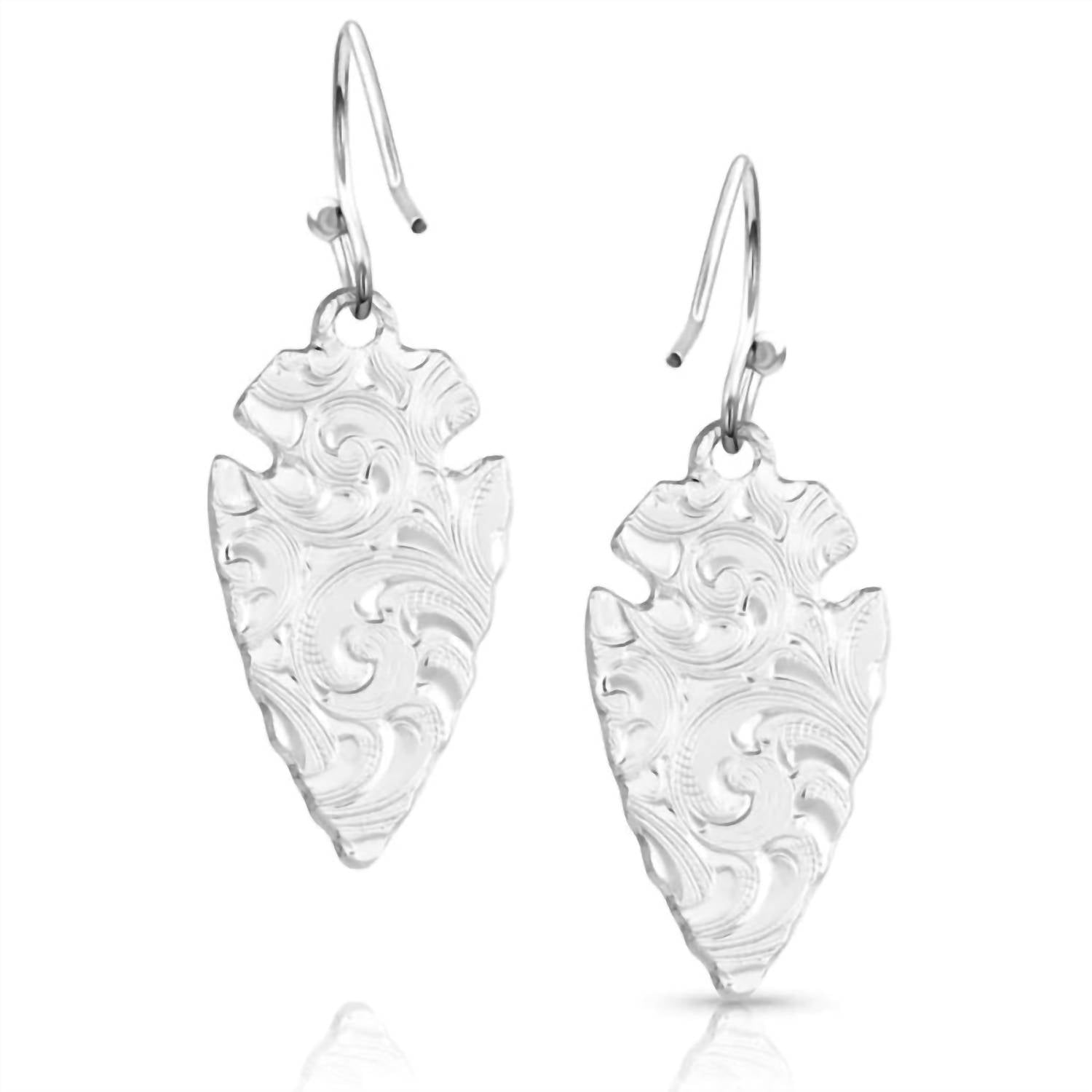 Classic earrings that will take you from season to season. Enhance your style with the Women's Chiseled Arrowhead Earrings by Montana Silversmiths, a stunning pair crafted with fine silver plating over brass. These earrings feature a beautifully chiseled arrowhead design that signifies strength and protection. They are secured with a hypoallergenic French wire, perfect for those with sensitive ears. Dimensions: width 0.44", height 0.84".
