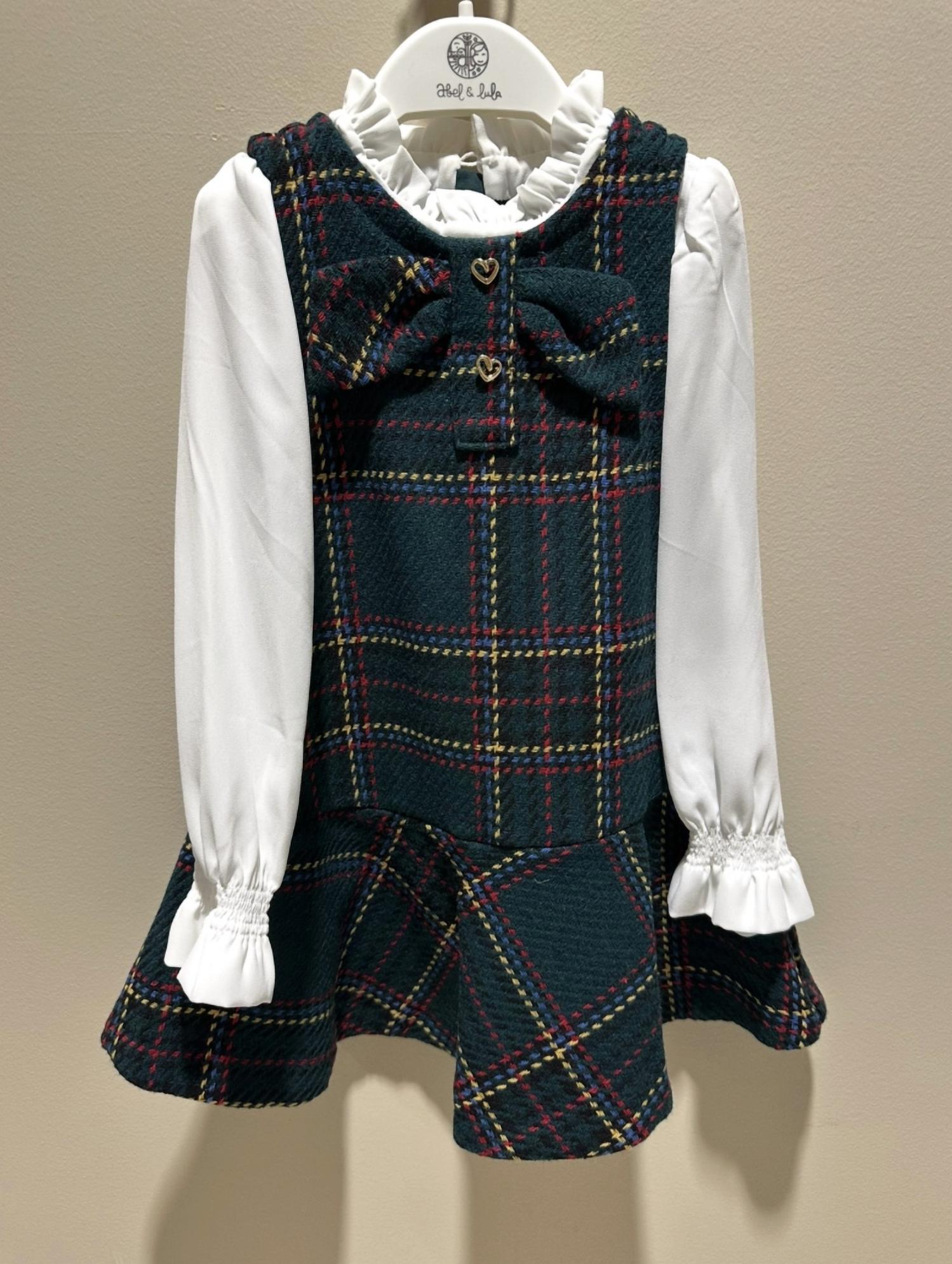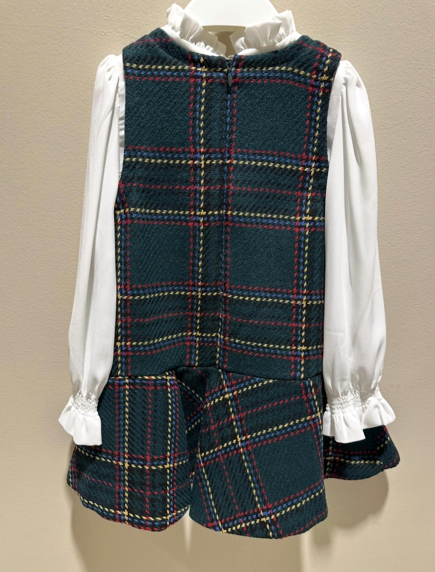 The Abel & Lula plaid pinafore dress features a sleeveless design with a full skirt, front ruffle detail, and decorative buttons, crafted in a deep green plaid pattern accented with red, yellow, and blue tones, finished with a concealed back zipper and designed to be styled over a coordinating white long-sleeved blouse with ruffled collar and cuffs for a classic, polished look.