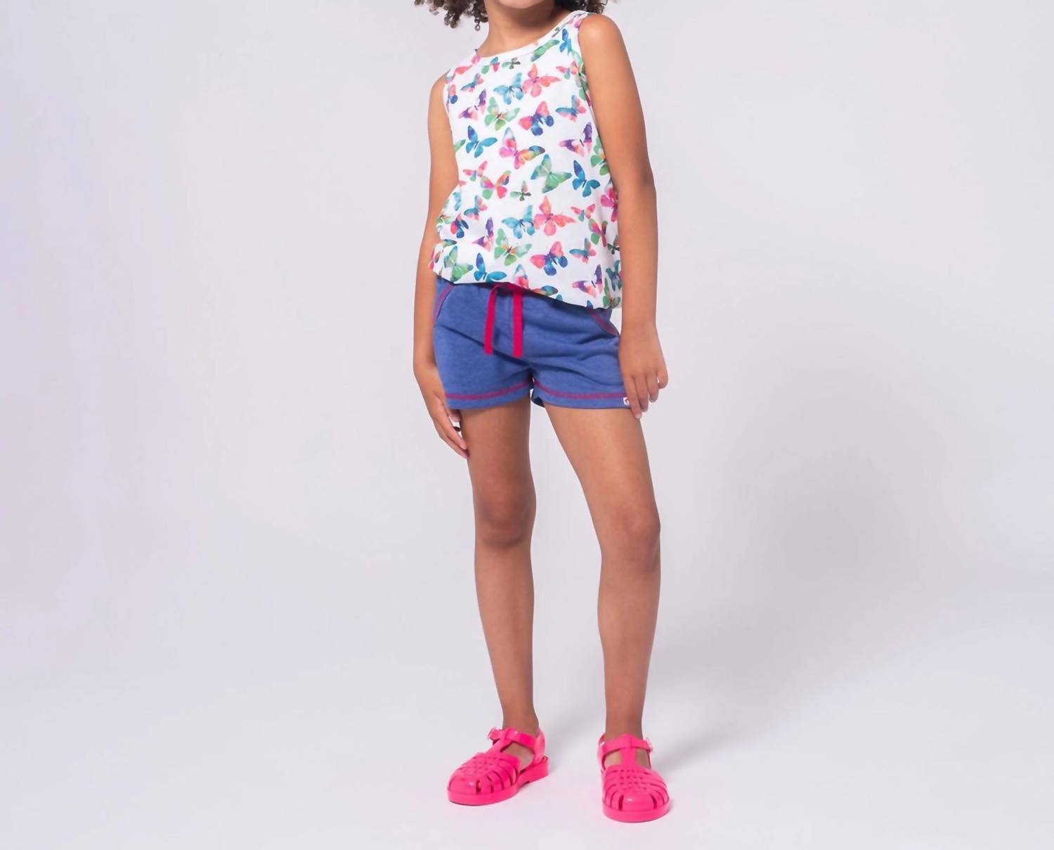Introducing the Hazel Butterfly Tank by Appaman, a delightful choice for girls who adore comfort and vibrant designs. This sleeveless piece is crafted from a soft blend of 80% Cotton and 20% Polyester, adorned with a chic watercolor-style butterfly print and a stylish twist-back detail. Care for this tank with ease: it's machine washable and can be tumble dried on low. Perfect for pairing with her favorite denim or flowy skirts, this tank is available at just $30, offering both style and affordability. Model is wearing size 6.