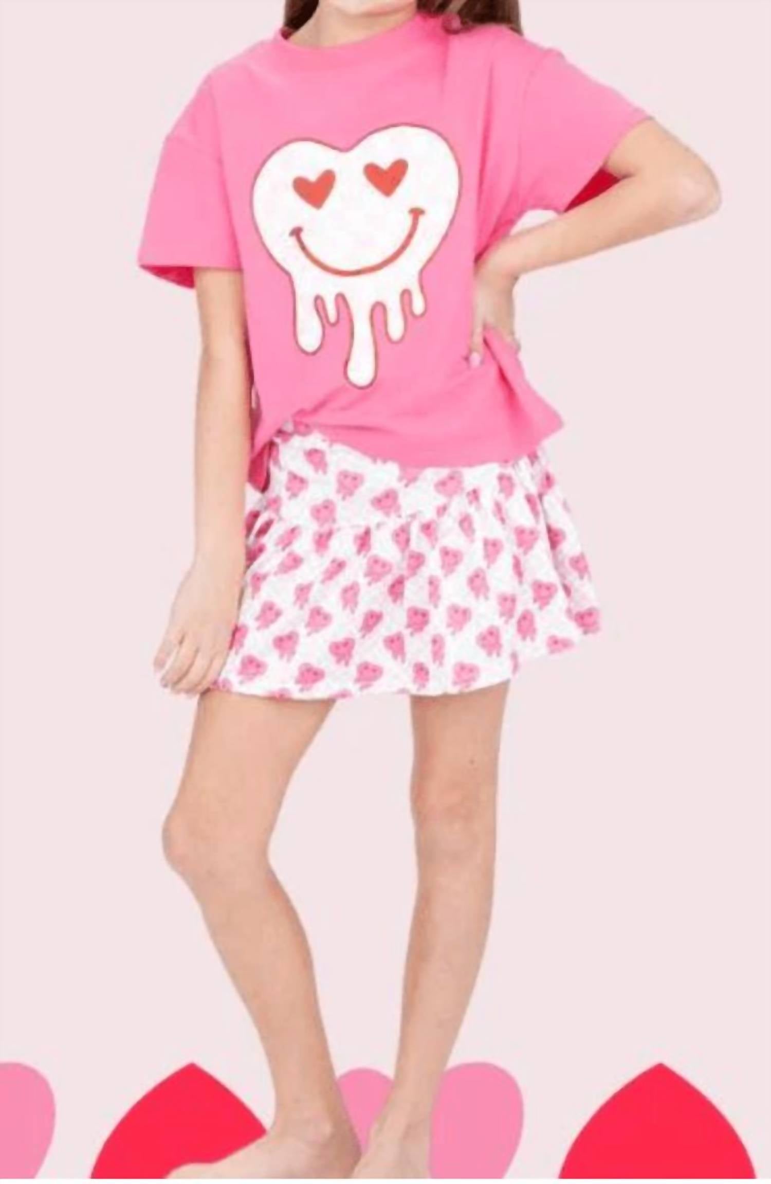 Elevate your style with the Glitter Heart Boxy Tee by Azarhia, designed in a vibrant hot pink for a bold statement. This graphic tee features short sleeves and showcases a glittery drip heart and smiley graphic, perfect for tween girls. Crafted from a soft blend of 95% Cotton and 5% Spandex, it ensures comfort and ease of wear. Care instructions include machine washing cold and tumble drying low.