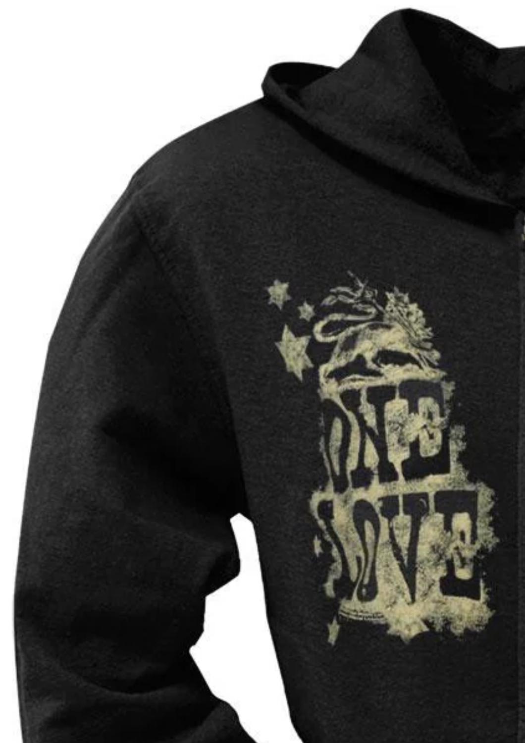 Embrace iconic style with the Teen's One Love Zip Hoodie by Bob Marley, a perfect addition to any streetwear collection. This black hoodie features long sleeves and a hooded neckline adorned with a striking graphic pattern, ideal for travel and casual wear alike. Closure: Zip-up. Care: Machine wash and tumble dry.