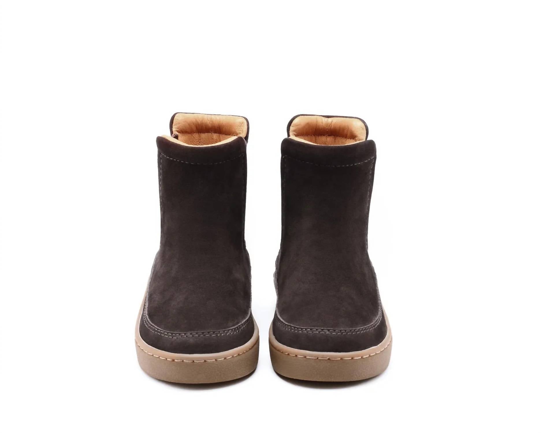 Introducing the Ojeh Boots by Donsje, crafted for little boys in a versatile dark brown nubuck. These Chelsea boots, made from 100% premium leather with a durable rubber outsole, are perfect for Fall and ideal for Thanksgiving adventures. They feature a minimalist round toe design with a flat heel for comfort during travel and everyday activities. Handmade and fair-trade, they are sure to be your child's favorite, thanks to their comfortable fit and easy slip-on style.