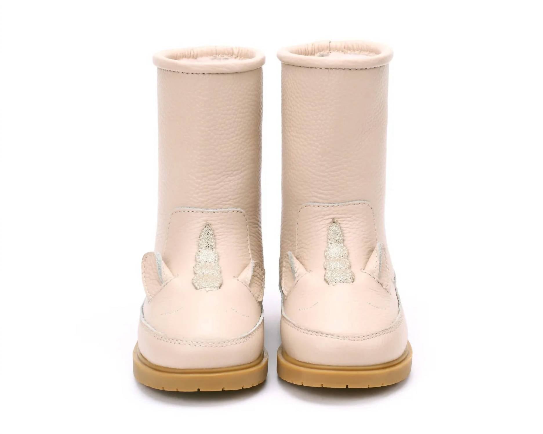 Introducing the Kid's Wadudu Special Lining Unicorn Boots by Donsje, a delightful addition to your child's wardrobe in Light Rose Leather. These handmade boots feature a 100% premium leather exterior with a cozy sheep wool lining, ensuring comfort and warmth during fall escapades. Designed with a flat heel and round toe, they feature a rubber outsole for sturdy traction, perfect for travel and play. The easy slip-on design makes them a practical choice for little adventurers, offering both style and functionality.