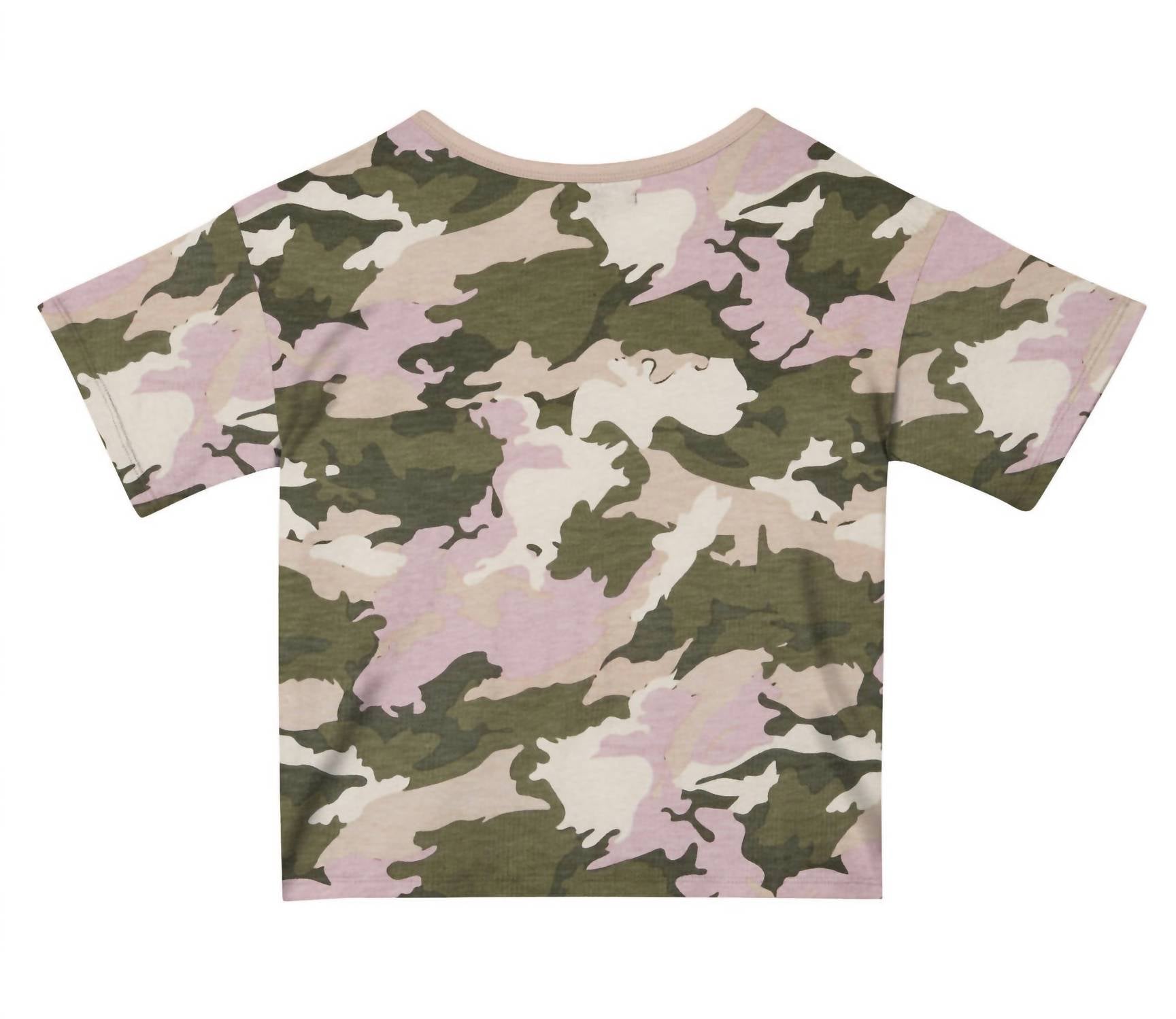 Embrace a playful twist on a classic pattern with the Girl's Best Friend Tee by Joe's Jeans. This short sleeve tee offers a relaxed boxy fit with a contrasting mauve pink ringer neckline, featuring an allover camouflage print in neutral hues of cream, green, and soft pink. Made from 100% cotton, it promises lightweight comfort that's perfect for pairing with your favorite leggings or denim. Care for it with ease: machine wash cold on gentle cycle and tumble dry low.
