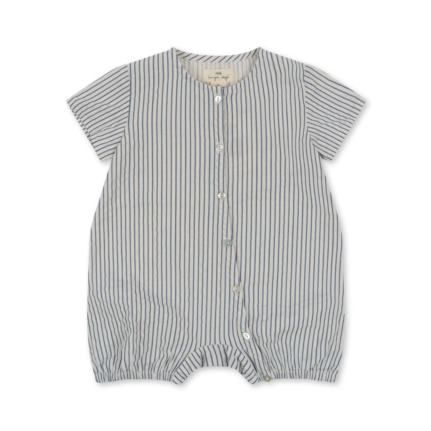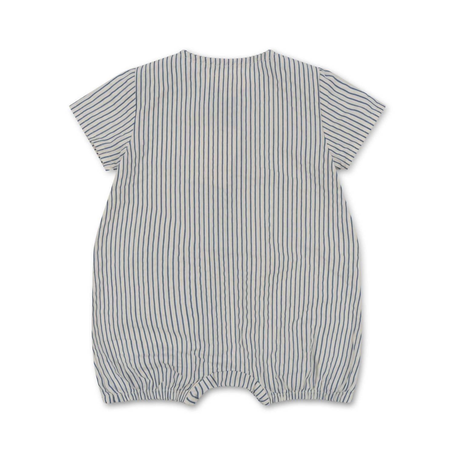 Introducing the Boys' Ace Romper by Konges Sløjd, designed in a Stripe Blue pattern to bring a touch of minimalist style to your child's summer wardrobe. This romper is crafted from 100% organic cotton, ensuring a gentle touch on young skin while maintaining durability. Originating from Denmark, it features convenient press buttons at the leg opening for easy wear. Care for this romper is simple with machine wash instructions, and it's safe for tumble drying.
