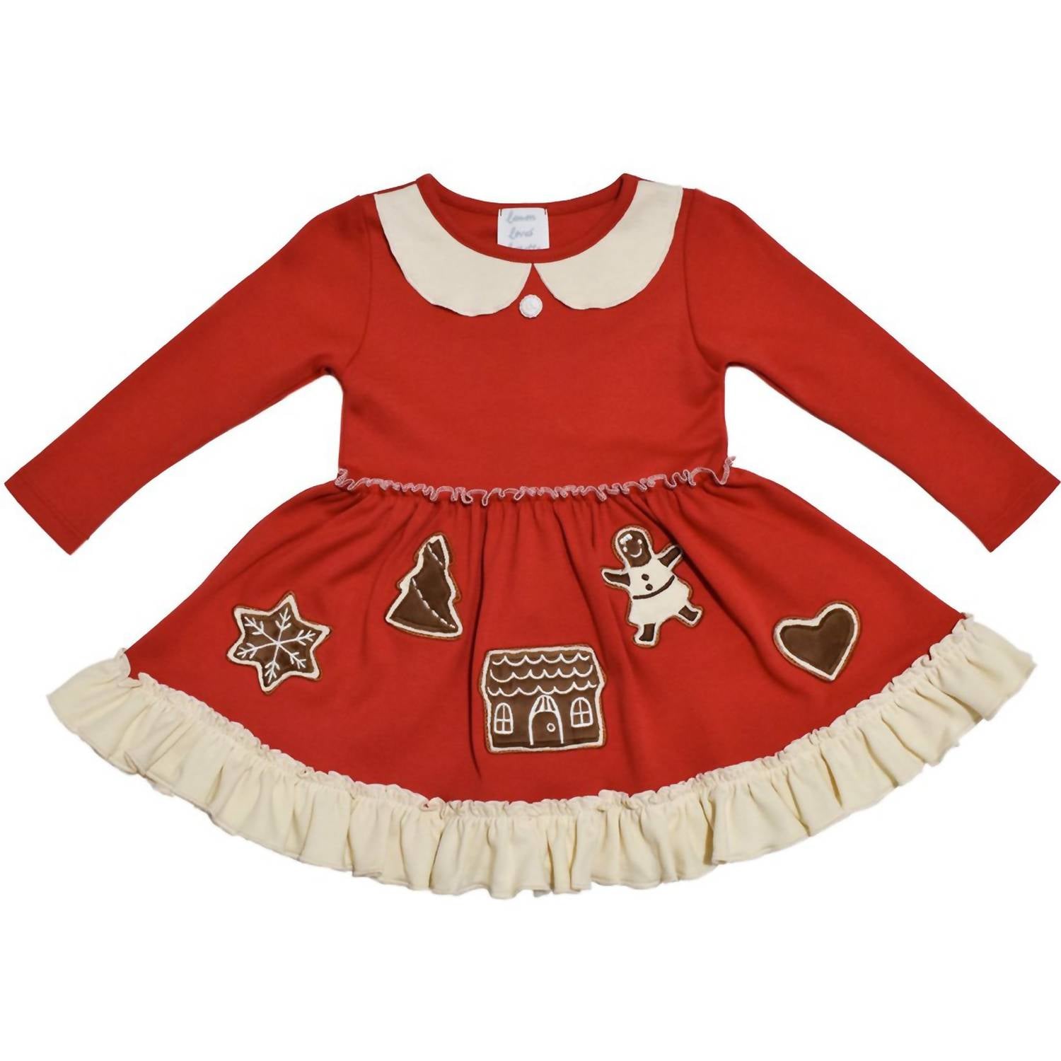Introducing the "Lil Sugar & Spice" Baby Dress by Lemon Loves Layette, a charming addition to your little one's wardrobe. Crafted from 100% Peruvian cotton, this dress is irresistibly soft on delicate skin. In a delightful True Red, it features a Peter Pan collar and ruffled hem in eggnog beige, adorned with playful gingerbread cookie icons. Perfect for holiday photos and gatherings, this dress embodies whimsical elegance.