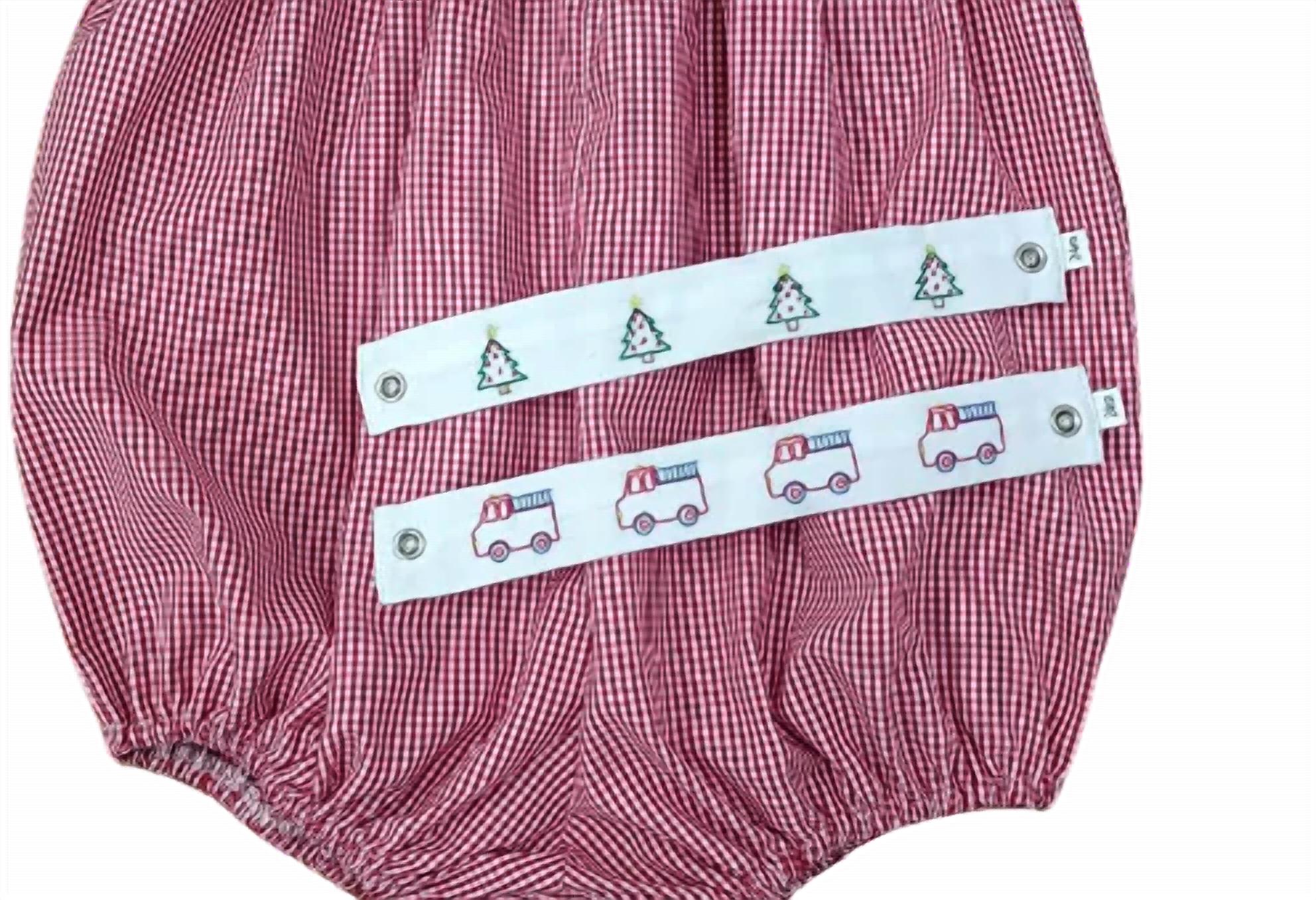Introduce your little one to timeless charm with the Girl's Noah Ribbon Bubble Romper by Lullaby Set, crafted in a delightful Ridgeland Red Minigingham pattern. Made from polyester, this romper embodies a vintage spring trend perfect for special occasions and travel during Thanksgiving. Featuring a unique gingham design, it comes with interchangeable ribbons for added personalization. Celebrate the seasons with ribbons themed for Back to School, Christmas, and firetrucks!