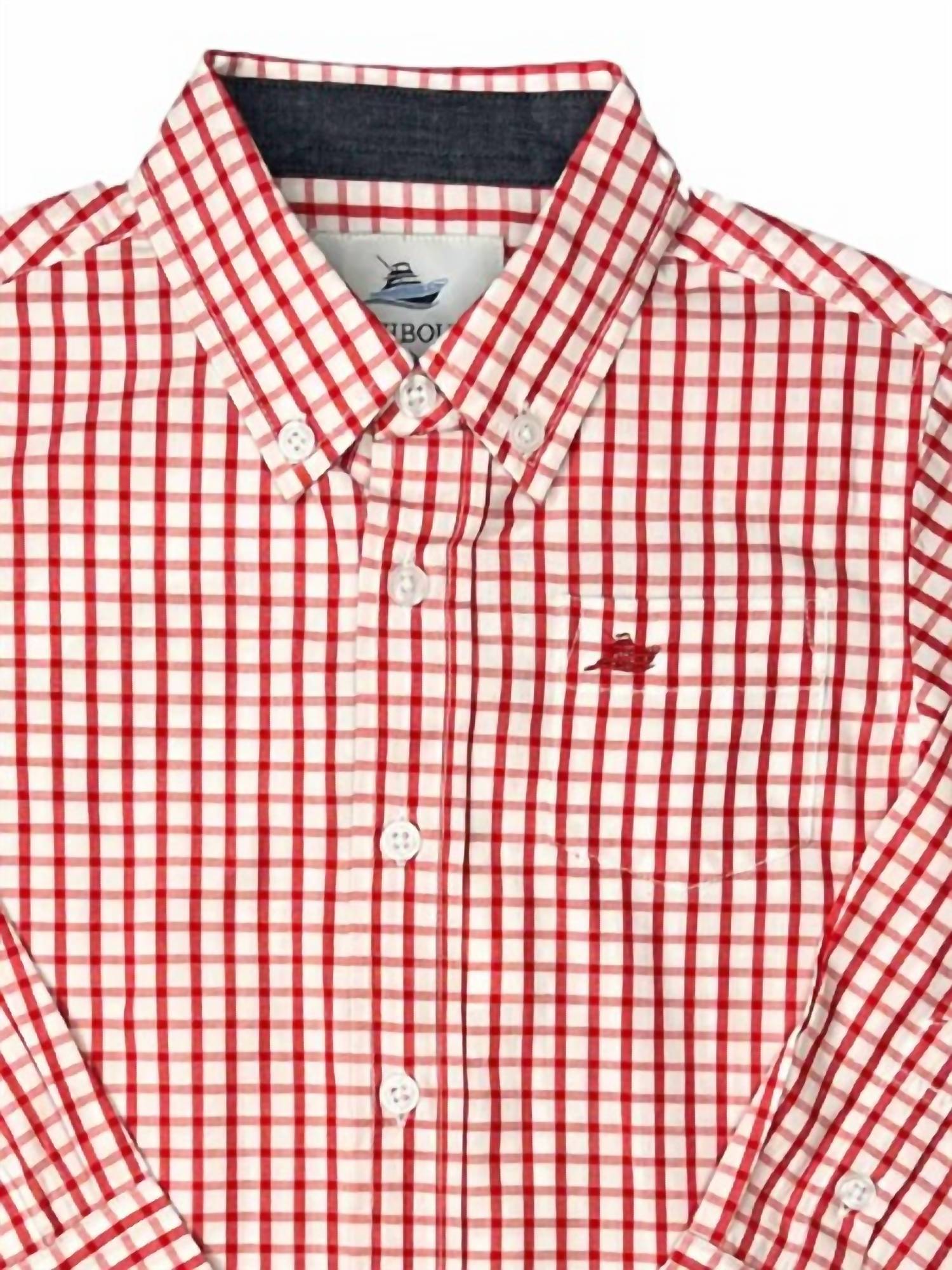 Enhance your young one's wardrobe with the Boys Long Sleeve Button Up Shirt by Southbound, featuring a classic plaid and check pattern in Red/White. Designed for both travel and Easter occasions, this shirt brings a refined yet versatile look. Crafted from 100% soft cotton, it boasts long sleeves and a traditional button-down front, complemented by an embroidered boat logo on the chest pocket. Origin: Unspecified. Care: Machine wash, tumble dry. Available in sizes 2T to 7.