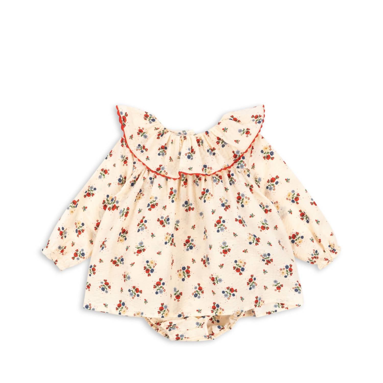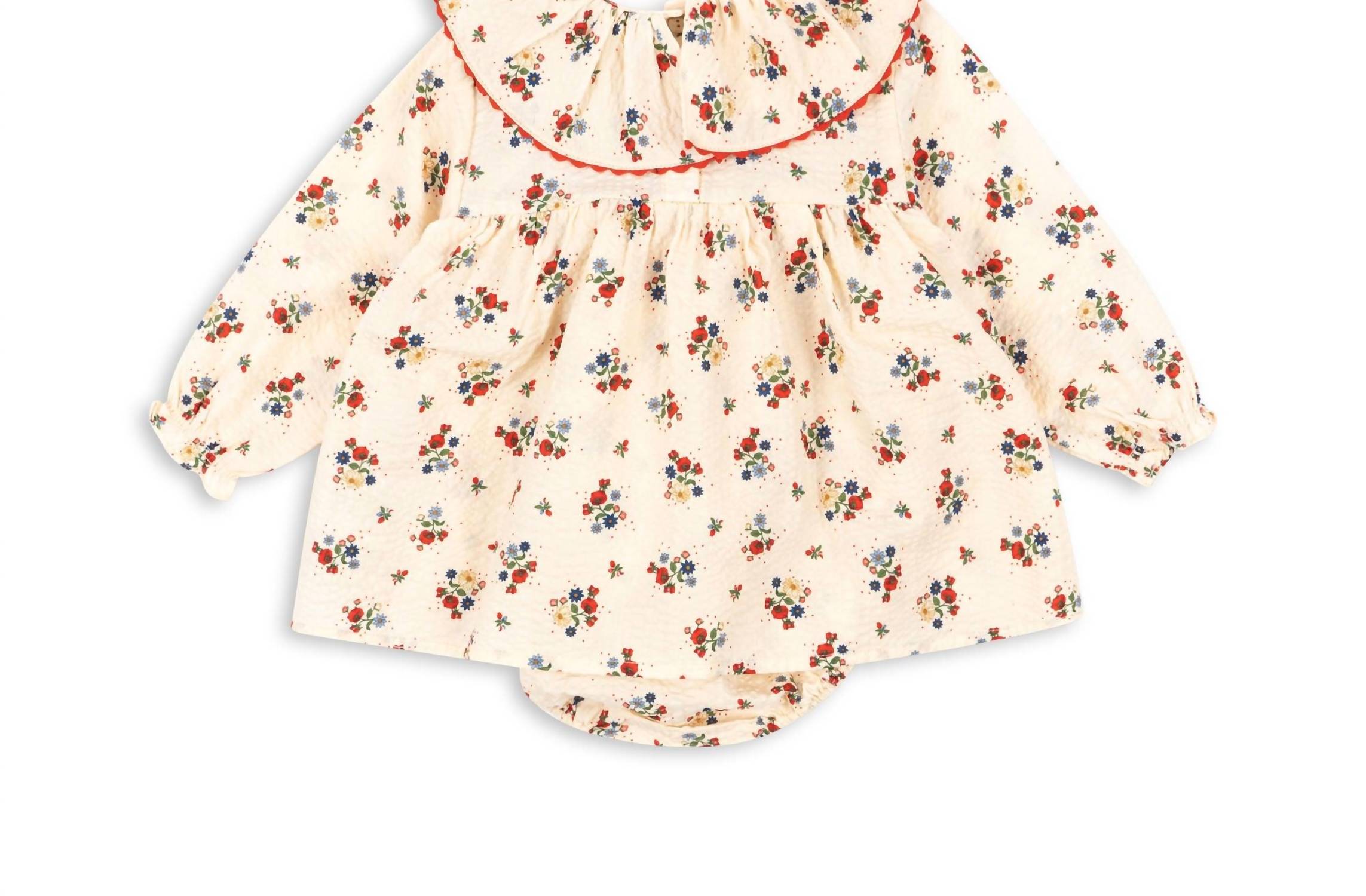 The Girls' Bella Frill Romper by Konges Sløjd is a delightful choice for your little one's wardrobe, especially for those warm spring days and Easter celebrations. This romper is crafted from 100% organic cotton, ensuring comfort and breathability for adventurous toddlers and snuggly newborns alike. Made in Denmark, it features convenient press buttons at the leg openings for sizes 1 month to 3 years, making it practical and easy to use. With its vibrant Fifi Fleur pattern, it embodies a playful maximalist trend, and can be machine washed and tumble dried for easy care.