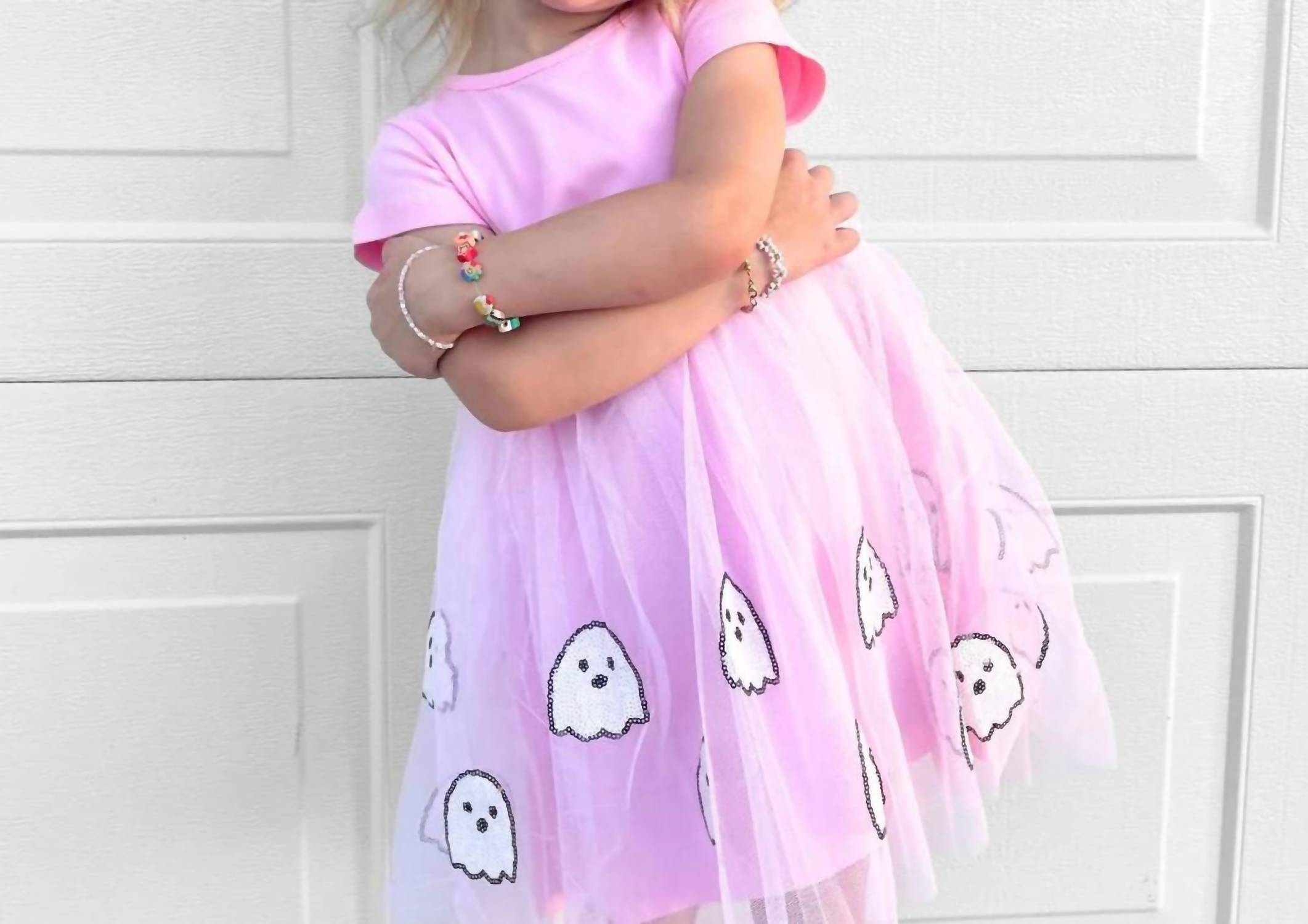 Celebrate Halloween in style with the Ghost Sequin Short Sleeve Tutu Dress by Sweet Wink. This charming dress features a pink cotton bodice paired with a light pink tulle skirt, overlaid with whimsical white and black sequin ghosts. Crafted from 95% cotton and 5% spandex, it offers comfort with a soft tulle that won’t scratch or itch, topped with an empire waist sewn with stretchy thread for added ease. Care for this delightful piece is simple with machine wash cold instructions; line dry to maintain its enchanting look.