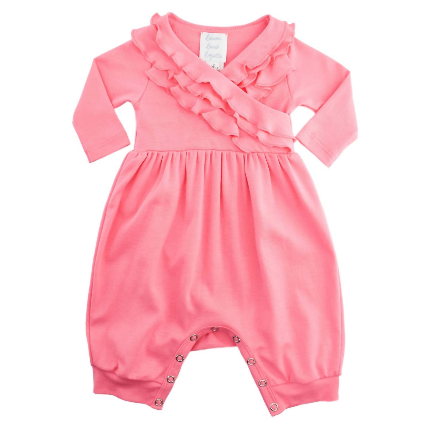 This "Elsa" romper in delicious pink lemonade is the newest style from Lemon Loves Layette for Take Me Home and everyday wear for infants. It features the same ruffled bodice as the Jenna gown in a romper silhouette.