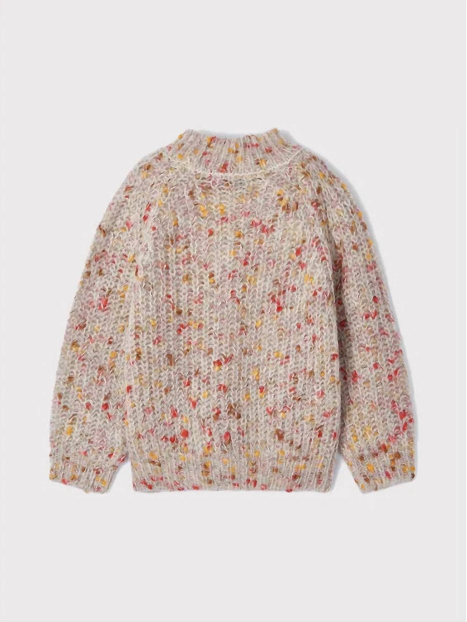 Wrap yourself in the Color Burst Sweater by Mayoral, perfect for adding vibrant flair to chilly fall and winter days. This sweater features long balloon sleeves, a turtleneck, and a textured pattern in a delightful multi-color palette. Crafted from soft acrylic, it is designed with dropped shoulders and ribbing at the cuffs and hem for added comfort and style. Ideal for back-to-school seasons, this piece aligns with 90s fashion trends, making it both contemporary and nostalgic.