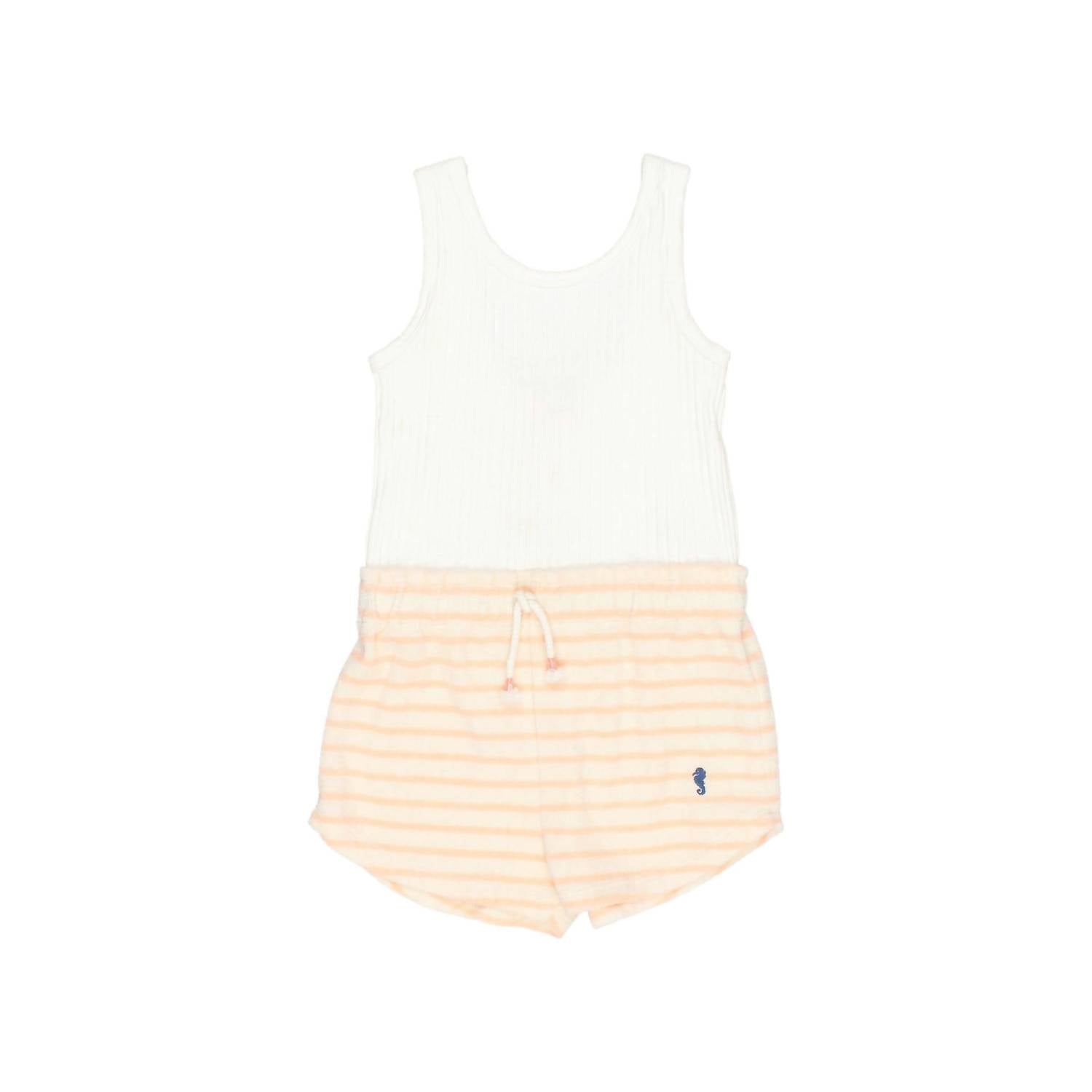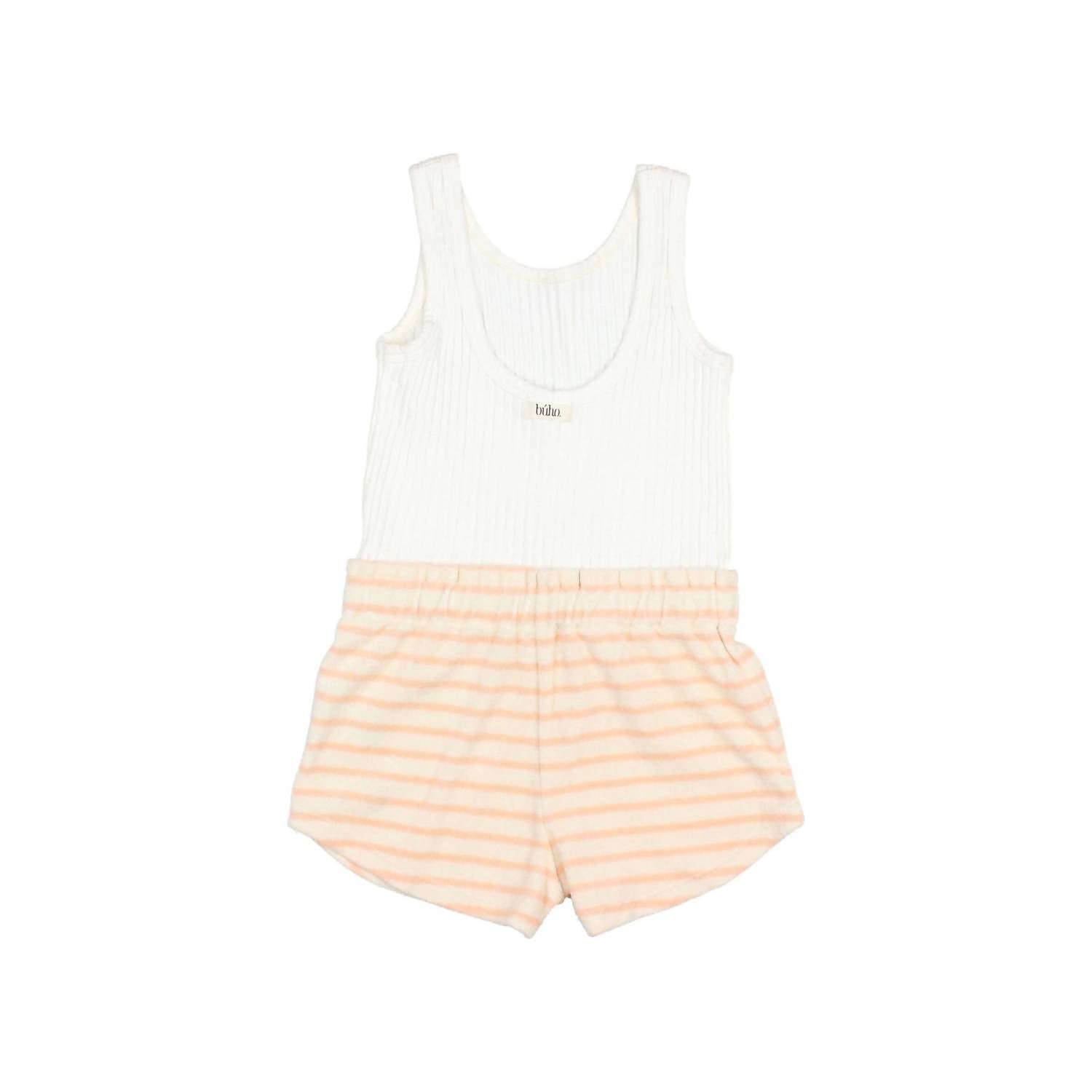Introducing the Girl's Terry Striped Jumpsuit by Búho, a stylish piece crafted from a cotton blend fabric in a delightful light pink hue. This strapless jumpsuit features an elastic waist with a decorative drawstring, offering both comfort and a charming touch. Made with a combination of ribbed texture and organic cotton terry, it highlights the brand's commitment to soft, carefully nurtured fabrics. Crafted in Spain, this jumpsuit is perfect for summer, combining playful stripes with the essence of quiet luxury.