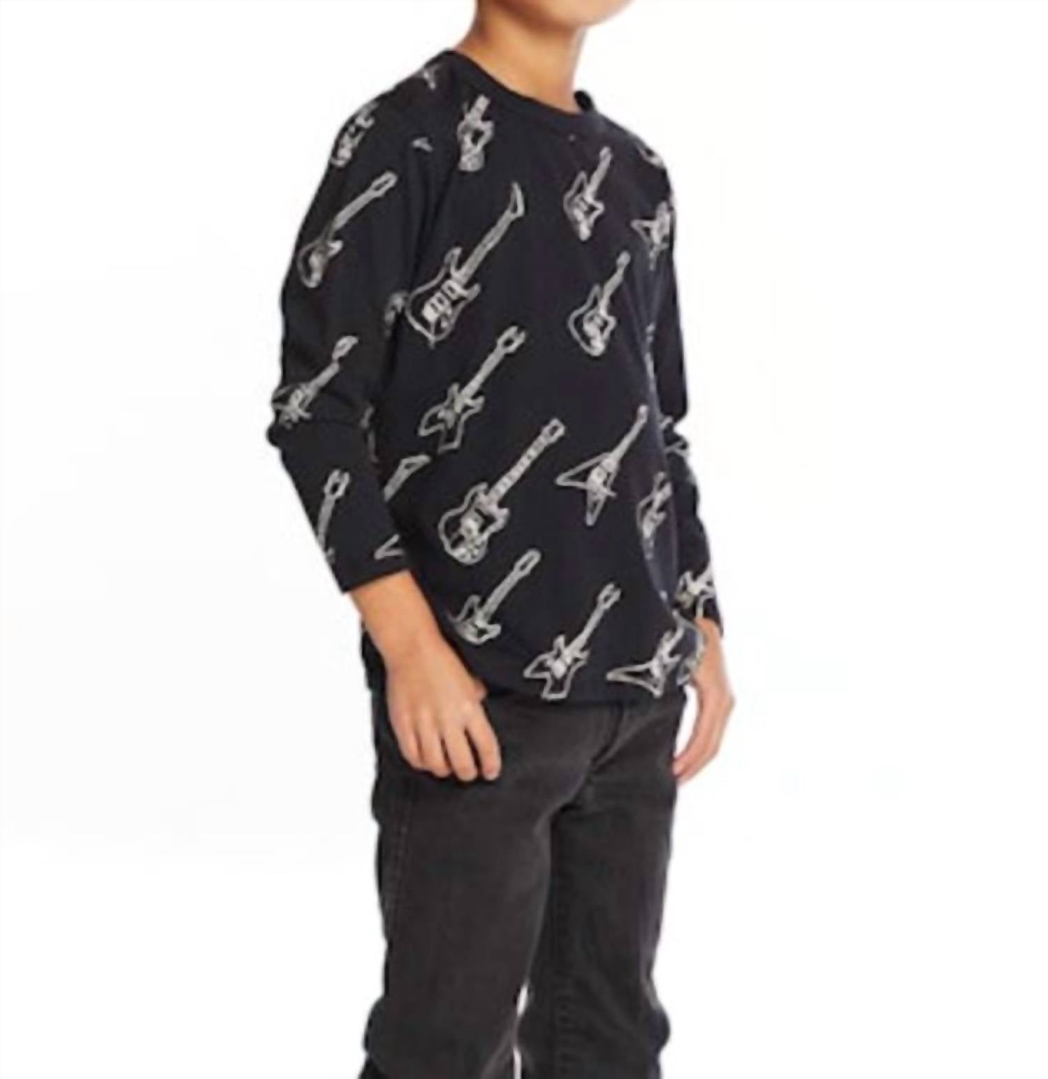 Introducing the Boys Guitar Jam Top by Chaser, a perfect pick for budding musicians. This long sleeve tee crafted from soft cotton features a standout guitar graphic throughout. The top comes in classic black, bringing a touch of streetwear style to your boy's wardrobe. Care: Machine wash cold on delicate, don't bleach, iron at low heat, and tumble dry on a low setting. Ideal for travel and perfect for the fall season.