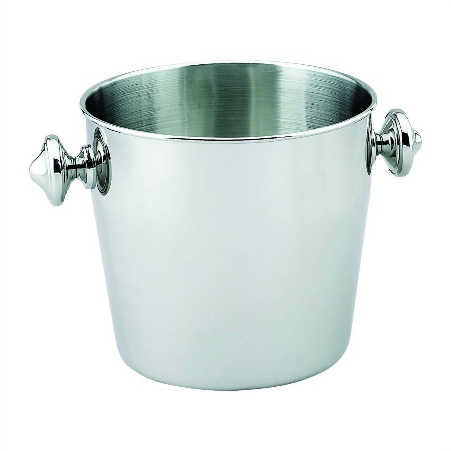 Balde de champanhe em aço inoxidável, fabricado em aço polido de alta qualidade. Este balde tem 19 cm de altura e 28 cm de largura de uma alça à outra. O compartimento de resfriamento tem 20 cm de diâmetro e os botões substanciais têm quase 7,5 cm de diâmetro — um belo elemento de design e totalmente funcional.