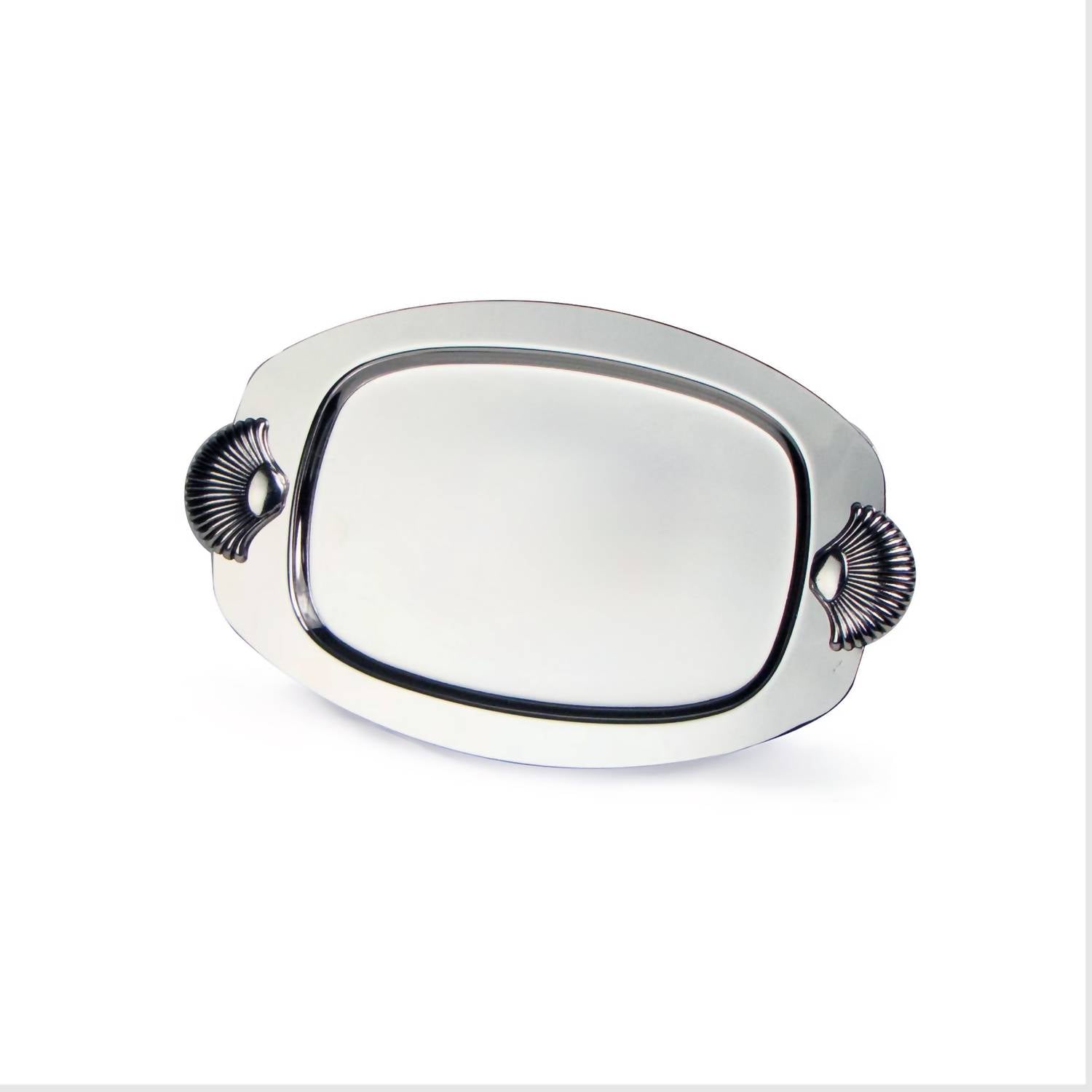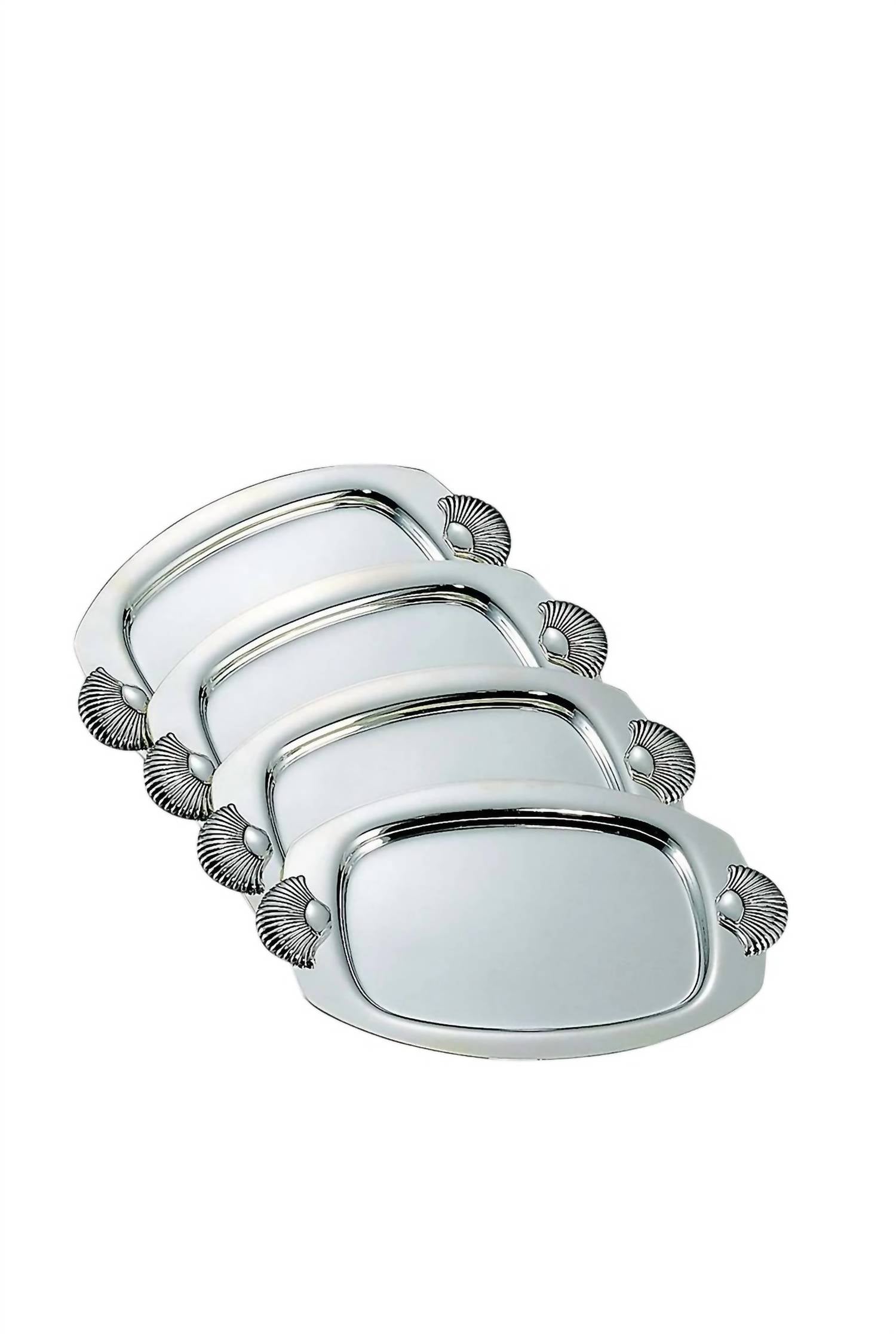 Cada prato mede 18 cm de comprimento x 10 cm de largura. Material: Metal niquelado com alças de concha fundida. Inclui: Conjunto de 4 pratos. Instruções de cuidado: Limpar com um pano macio e seco para manter o brilho. Metal. Lavar à mão. Importado.