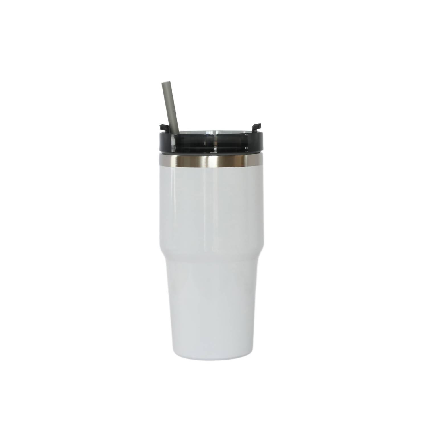8,9 cm x 19,4 cm. Capacidade: 590 g. Material: Aço inoxidável premium. Canudo para facilitar o consumo.
