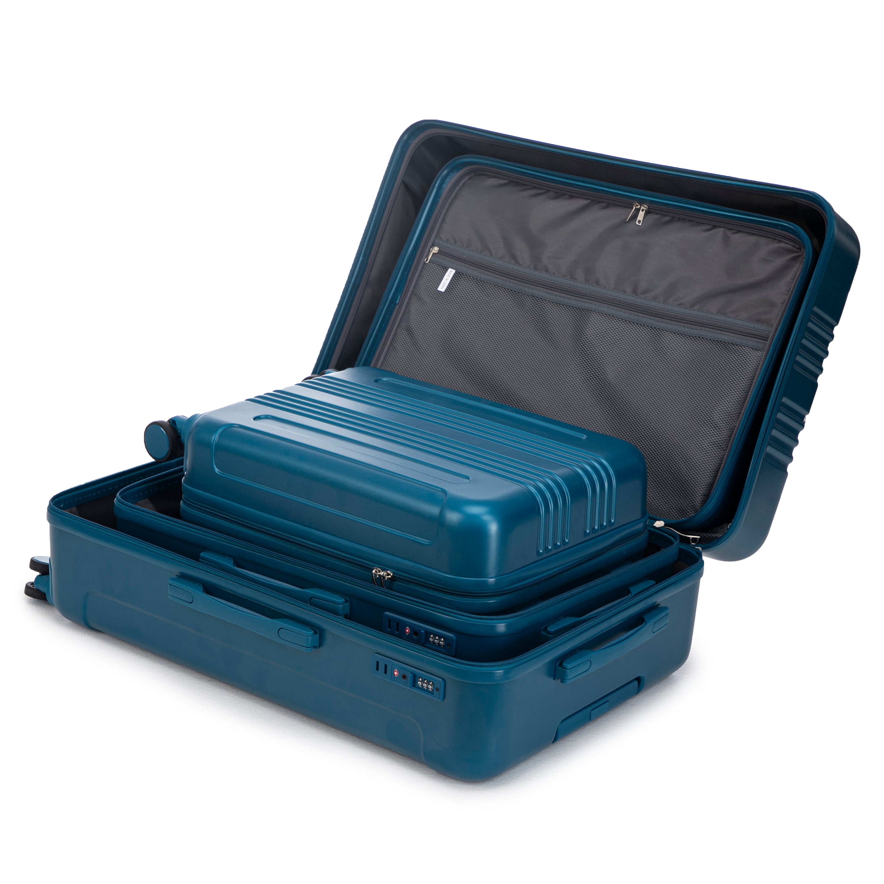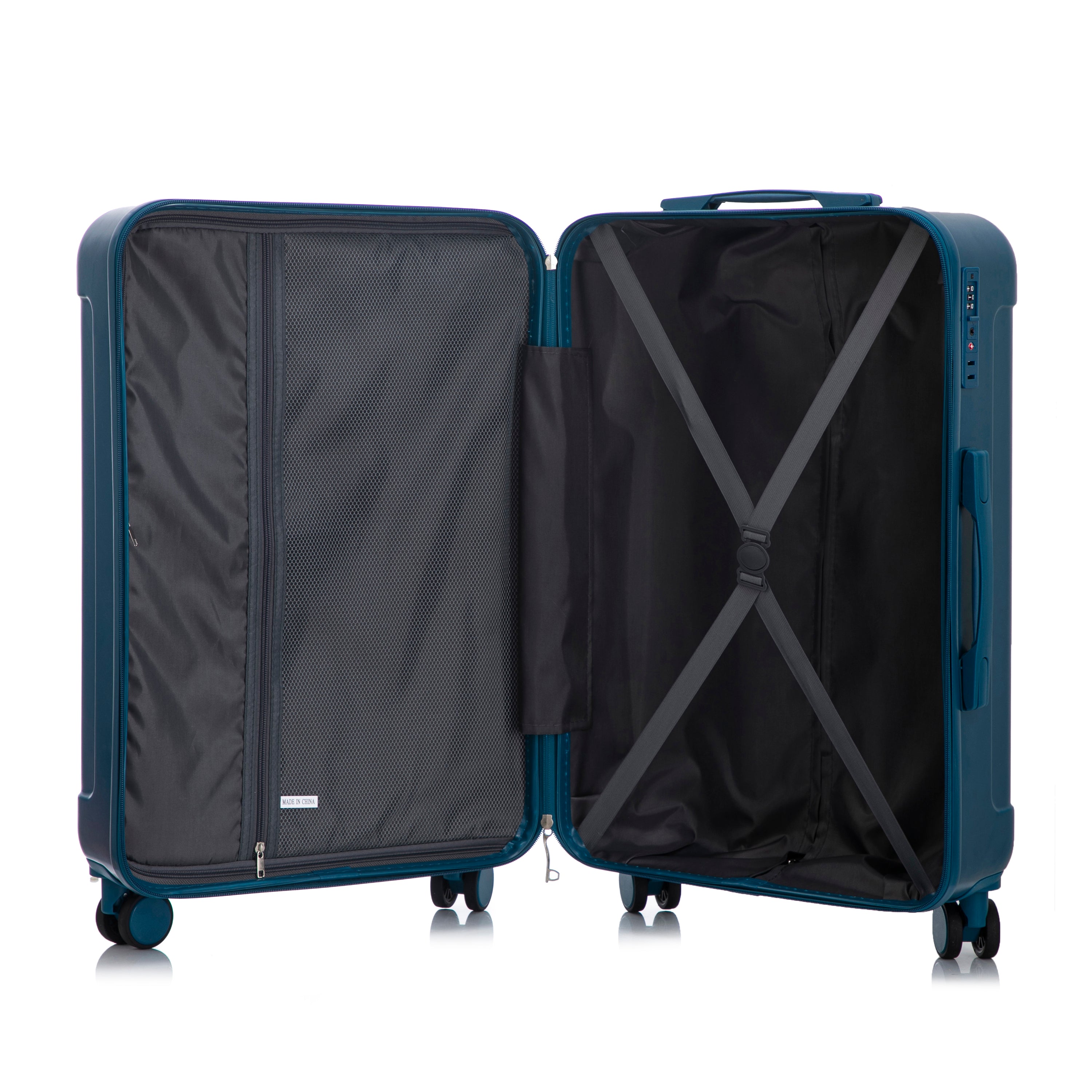 Each suitcase includes a fully lined interior with a zippered compartment, cross straps, and multiple storage layers to keep your belongings neatly organized. The low-profile top and side handles make lifting and carrying easy.