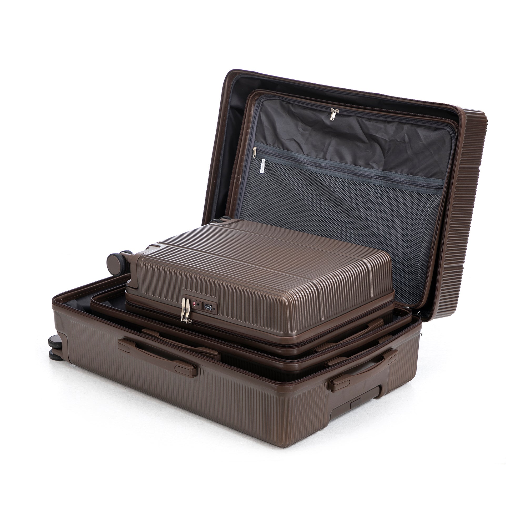 Each suitcase includes a fully lined interior with a zippered compartment, cross straps, and multiple storage layers to keep your belongings neatly organized. The low-profile top and side handles make lifting and carrying easy.
