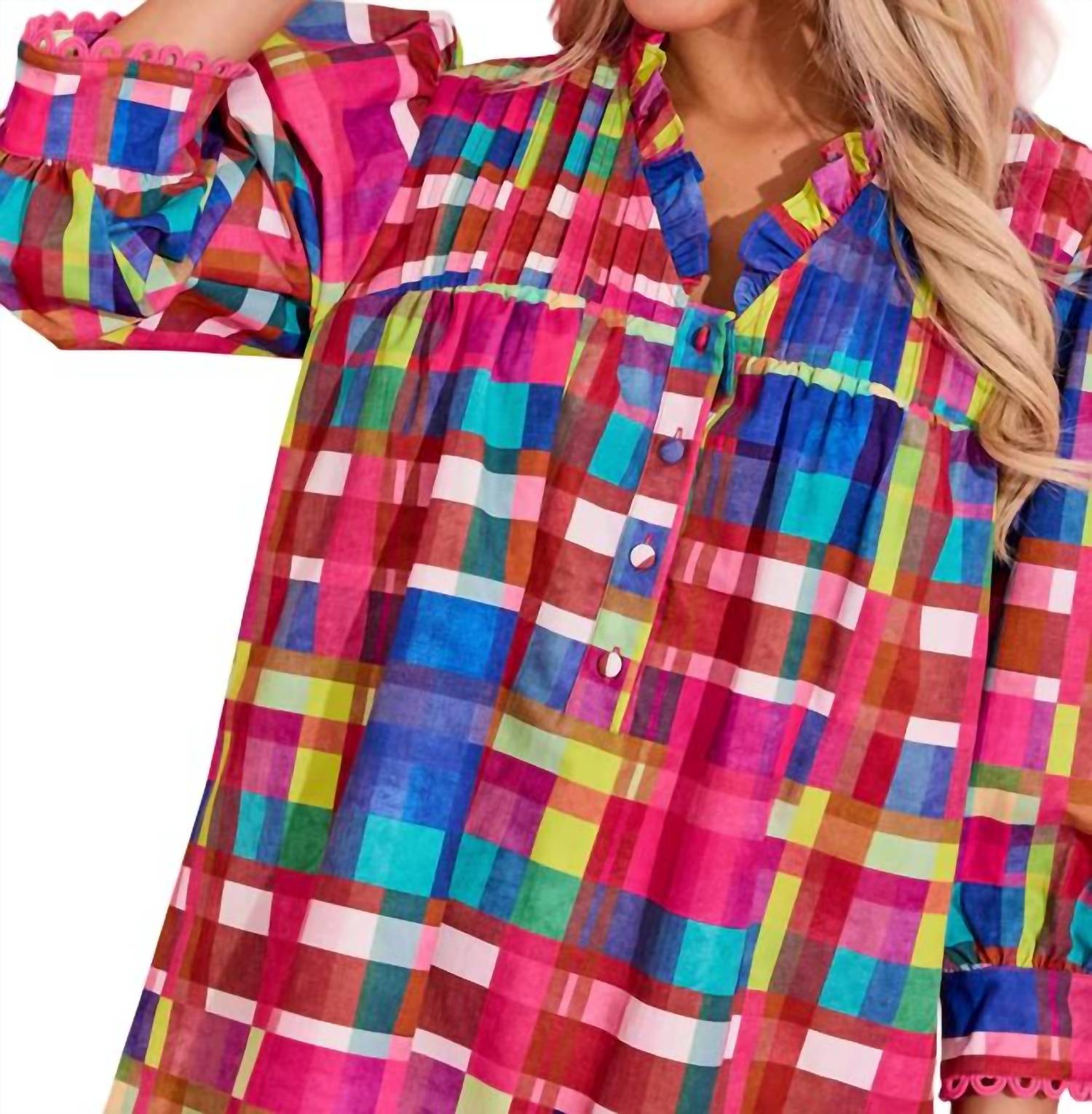 The kind of easy and flattering dress you'll be reaching for all season long. The Lori Dress by Alden Adair in vibrant Circus Plaid is a playful addition to your wardrobe. This mini dress features three-quarter voluminous puff sleeves and a shift silhouette with a classic collar. Made from soft 100% Polyester, it offers a relaxed fit with bold plaid and check patterns, complete with delicate trim details. Closure: Button closure. Care: Machine wash and tumble dry.