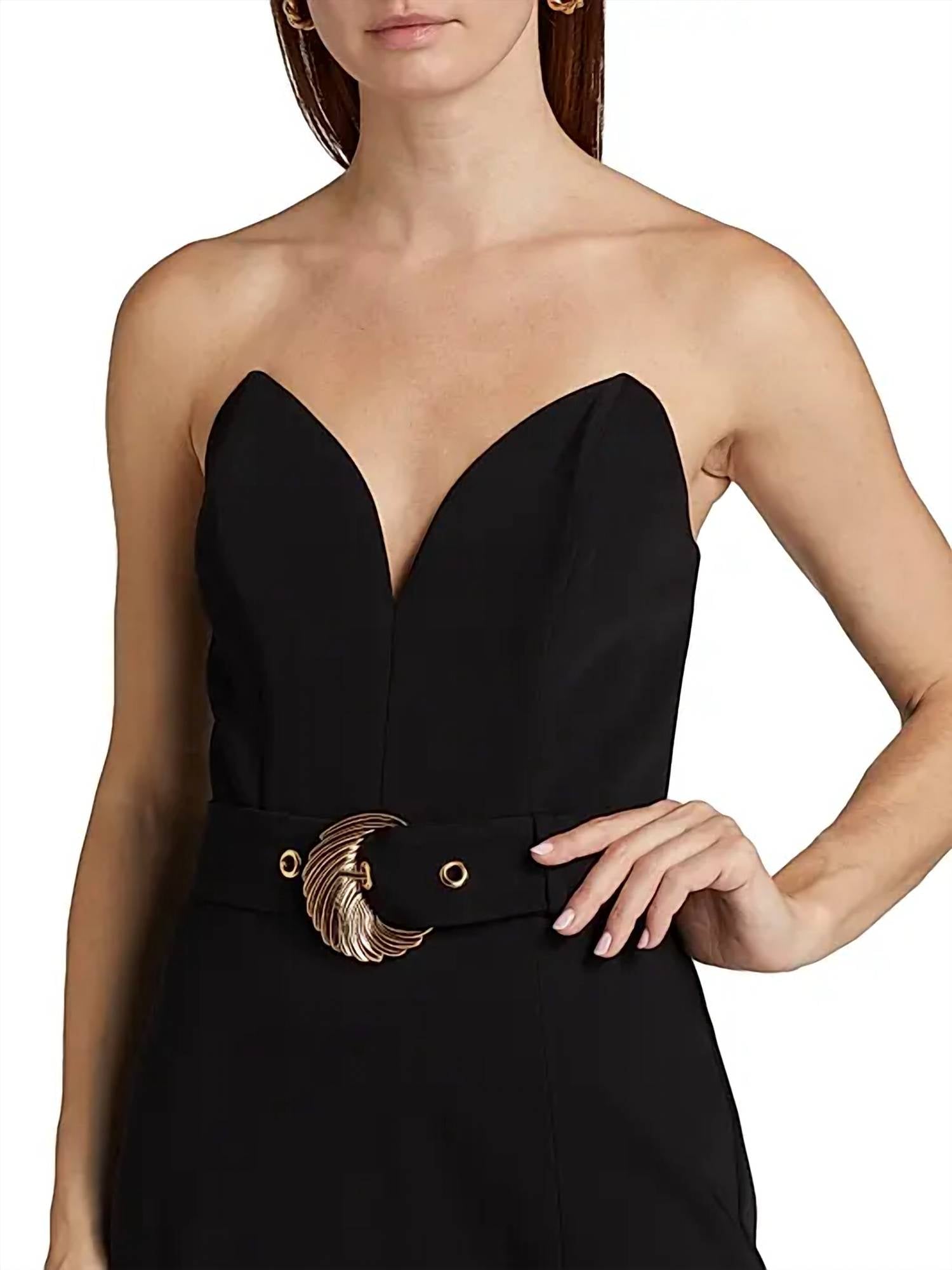 The kind of easy and flattering dress you'll be reaching for all season long. Step into the spotlight with the Chalice Mini Dress by Amanda Uprichard, a holiday party essential in chic black. Designed with a strapless A-line silhouette, this dress features a deep sweetheart neckline and a structured bodice for an ultra-hot statement. Crafted from 100% polyester with a comfortable polyester lining, it includes a small center-front slit and a self-belt with a chunky silver metal buckle for added allure. Made with a convenient zip closure, it requires dry cleaning for care.