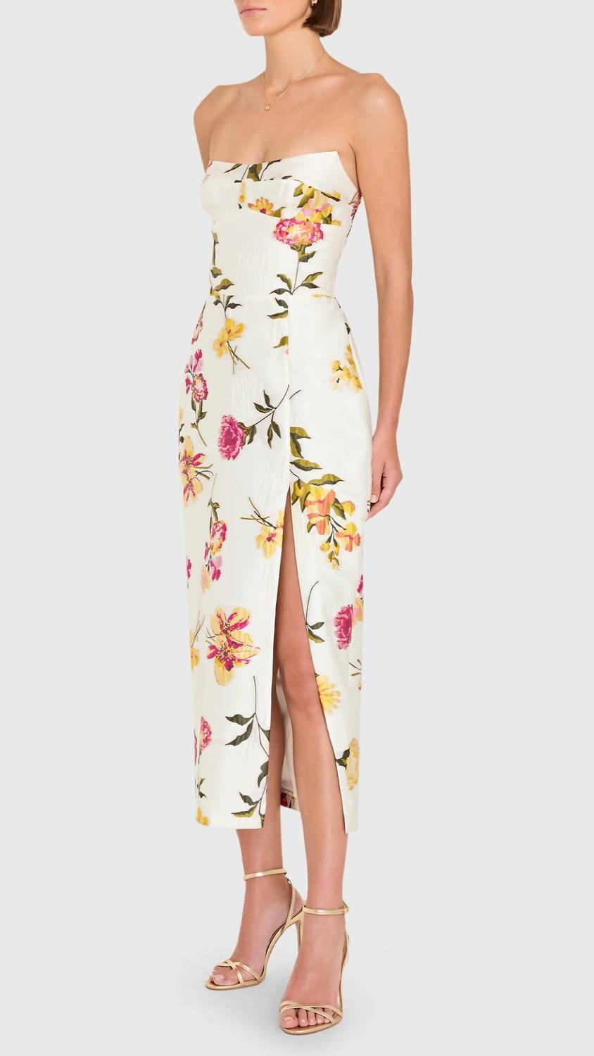 Just add slides or mules and you are good to go. Introducing the Ivy Strapless Midi Dress by Amanda Uprichard, perfect for your next engagement or Easter celebration with a Boho Chic flair. Crafted from 93% polyester and 7% nylon with a floral white multi design, this shift dress features a structured bralette bodice and smocking at back panels for a comfortable fit. Fitted with an invisible zip closure at the center back with a hook & eye, it also boasts a chic slit at the center front left leg. Care should be taken to dry clean only for lasting quality.