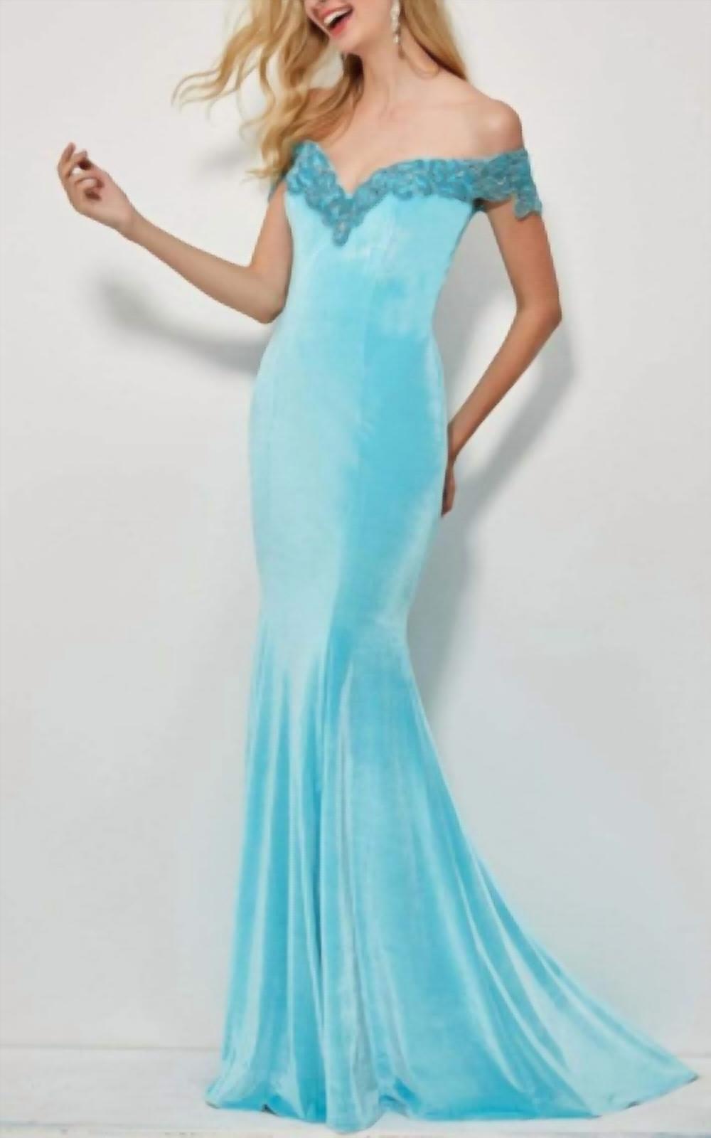 A maxi dress that is just as cute as it is comfortable. Angela & Alison off the shoulder velvet gown with beaded detail on sweetheart neckline. Spot clean only