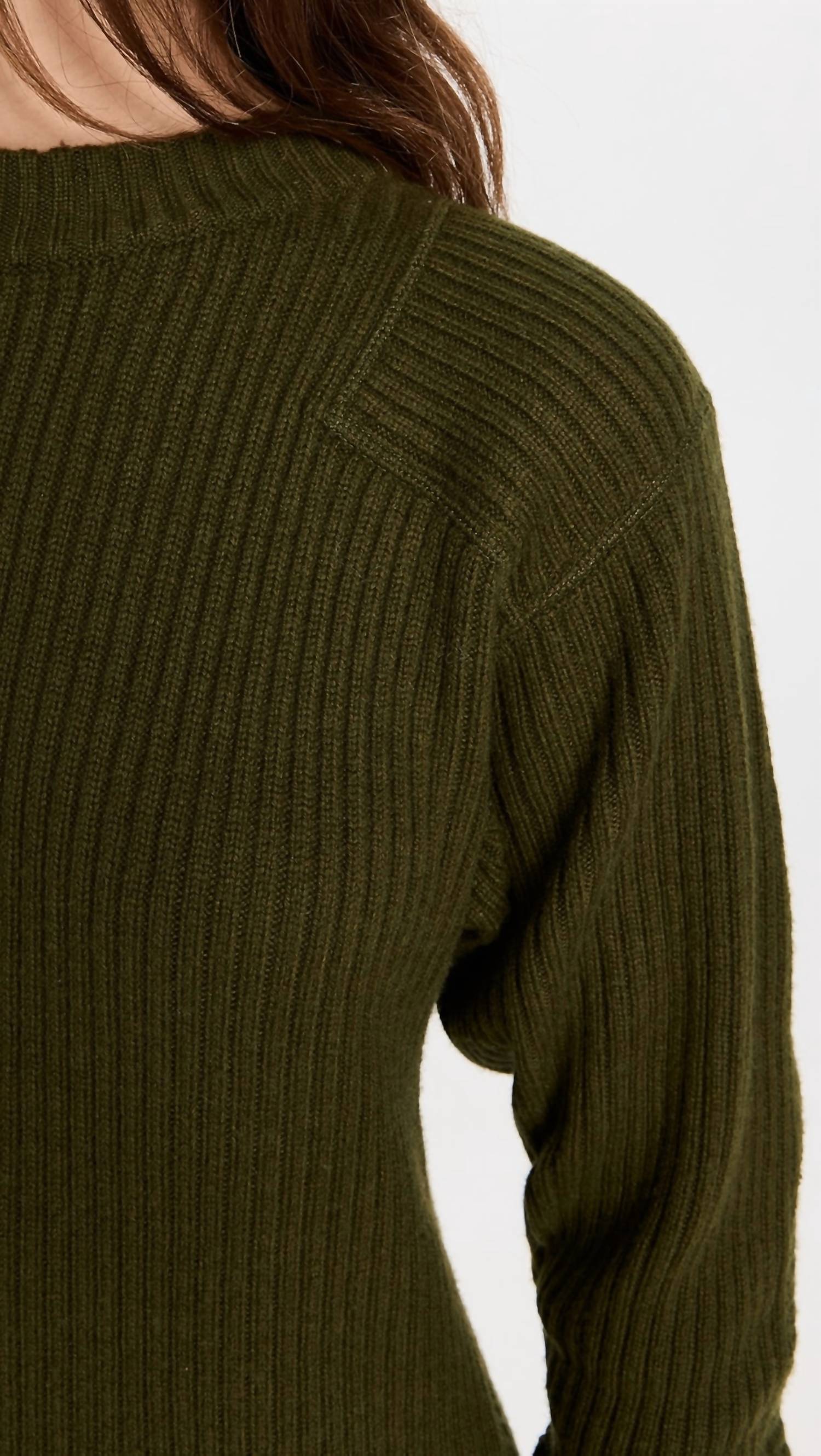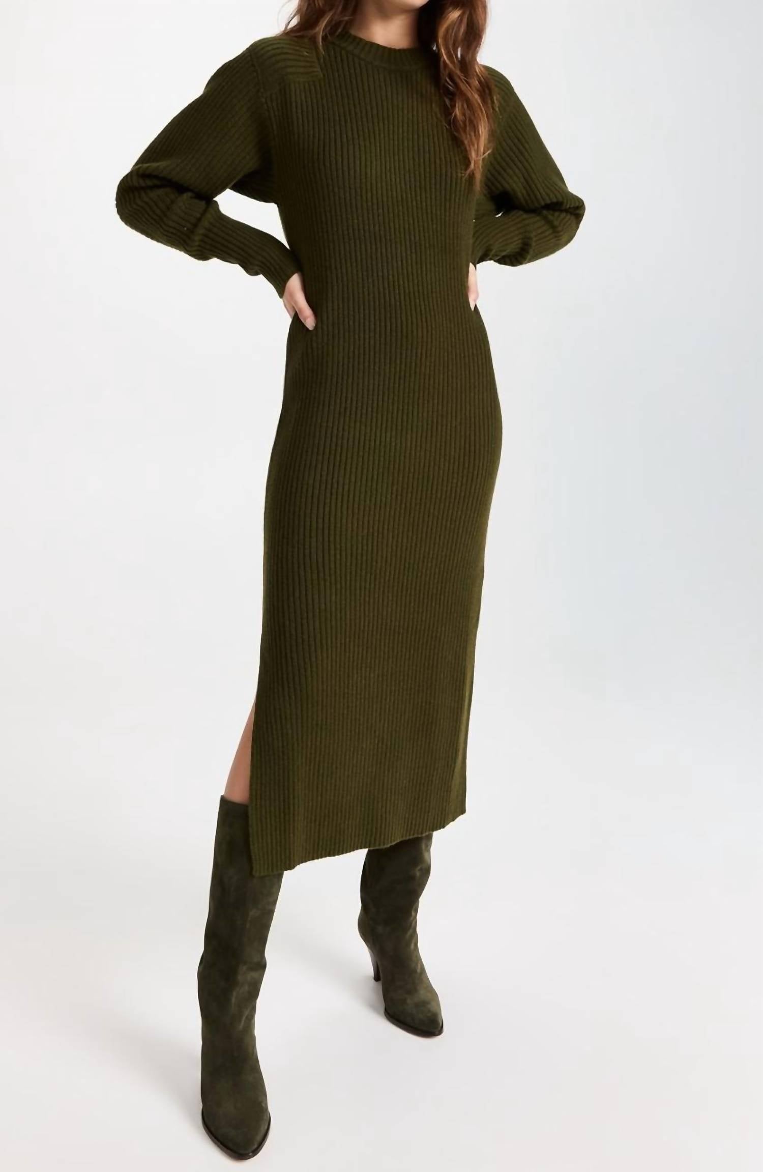 Elevate your wardrobe with the Aurora Dress by ANINE BING, a sophisticated midi-length piece in textured Army Green. Tailored with long sleeves, this sweater dress features a stylish crew neckline and subtle shoulder padding crafted for a relaxed silhouette. Made in a high-quality blend of 50% Nylon, 35% Wool, and 15% Acrylic, it boasts a comfortable pull-on closure and a chic side seam slit. Care for this elegant piece with dry cleaning to maintain its refined shape. Length: 47.25 inches.