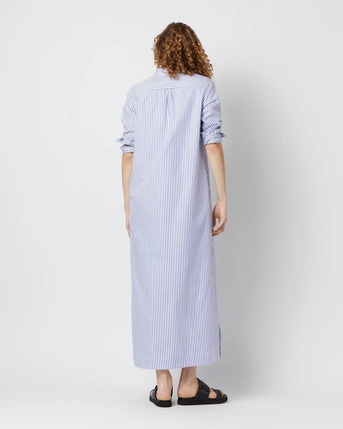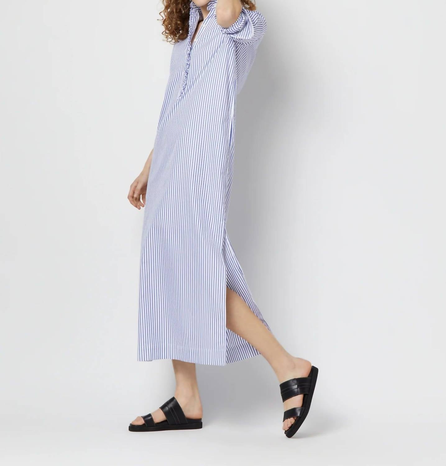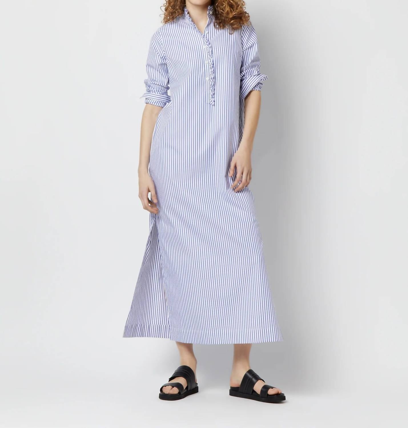 The Frill Talitha Pinpoint Shirt Dress by Ann Mashburn is a perfect blend of minimal design and maximalist trend in a refreshing blue and white stripe, ideal for a summer wardrobe. Featuring three-quarter sleeves and crafted from 100% Italian cotton pinpoint, this dress offers a shirt silhouette with a maxi hemline made in Honduras. The garment includes unfinished raw-edge frill detail at the neckline, enhanced by a popover placket and 3.5mm Trocas shell buttons. Designed for versatility, it includes on-seam side pockets and side slits, with care instructions advising machine wash cold, line dry, and medium iron.