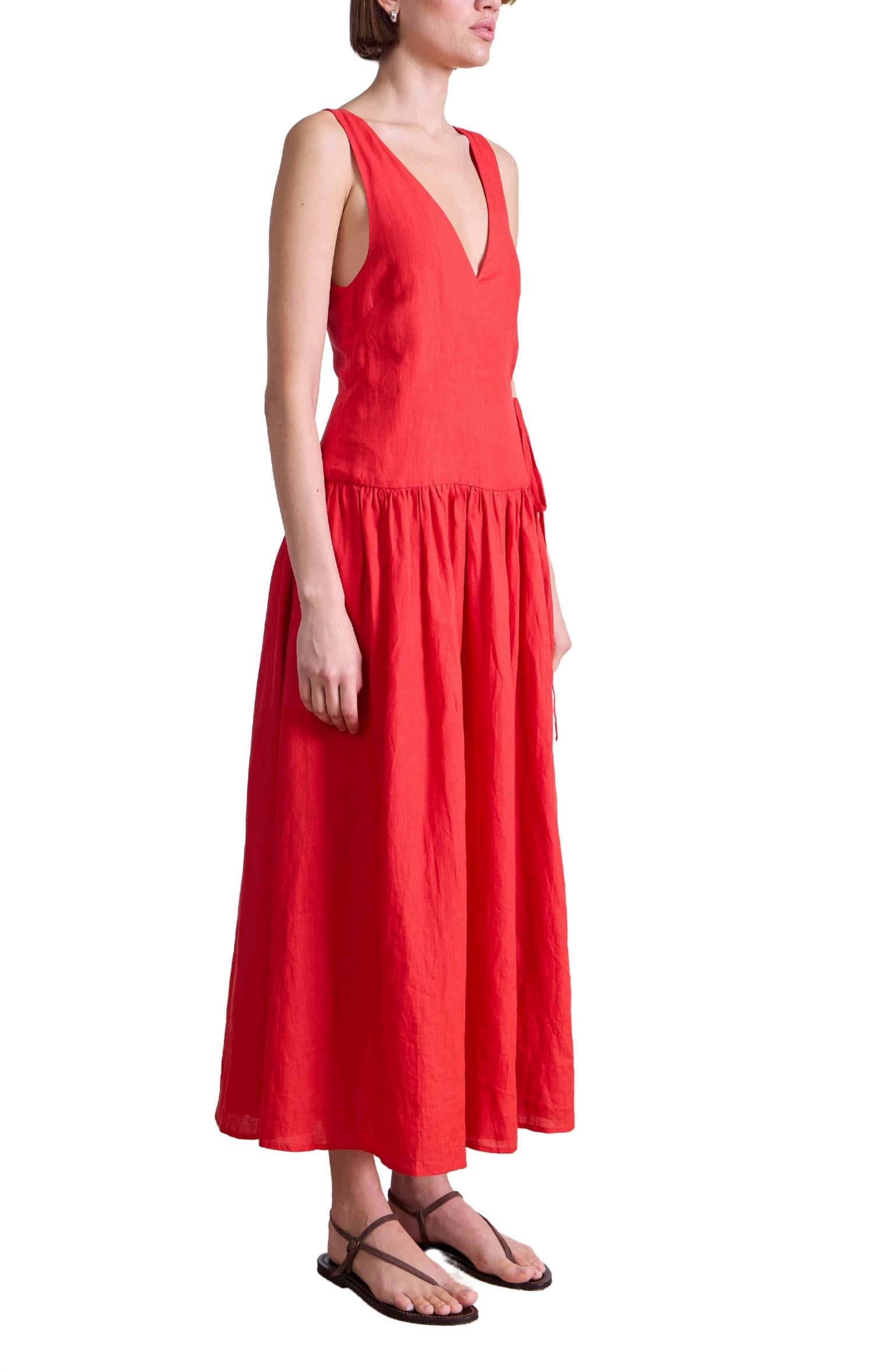 A maxi dress that is just as cute as it is comfortable. Perfect for sun-soaked soirées and romantic getaways, the APIECE APART Tiered Wrap Maxi in poppy red brings effortless bohemian elegance to your warm-weather wardrobe with its flowing silhouette and vibrant hue. V-neck. Sleeveless. Maxi length. Self-tie wrap closure at waist. Soft A-line shape. Tiered construction. 100% linen. Dry clean only. Made in India. Fits true to size. Length 53" from size 4.