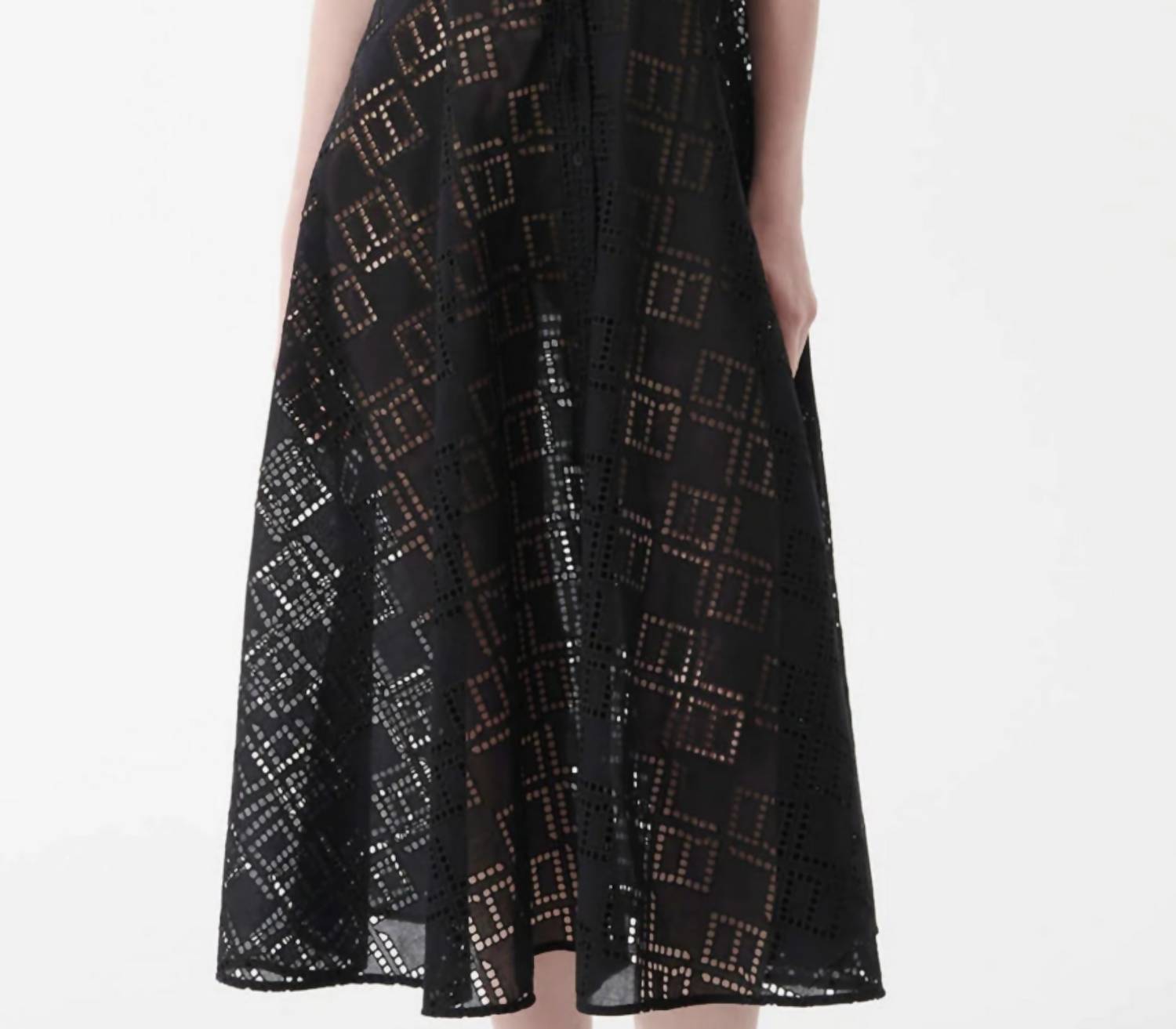 Introducing the Broderie Chemisier Midi Dress by Beatrice .b, a sleek addition to your evening wardrobe in elegant black. This sleeveless dress is crafted from Cotton Broderie Anglaise, showcasing a contemporary, three-dimensional pattern with a collar and lapel that leads to a button closure accented with laces. Made in Italy, this A-line silhouette combines luxury with a quiet sophistication, perfect for spring events or a Mother's Day celebration. Underslip included to complete your timeless look.