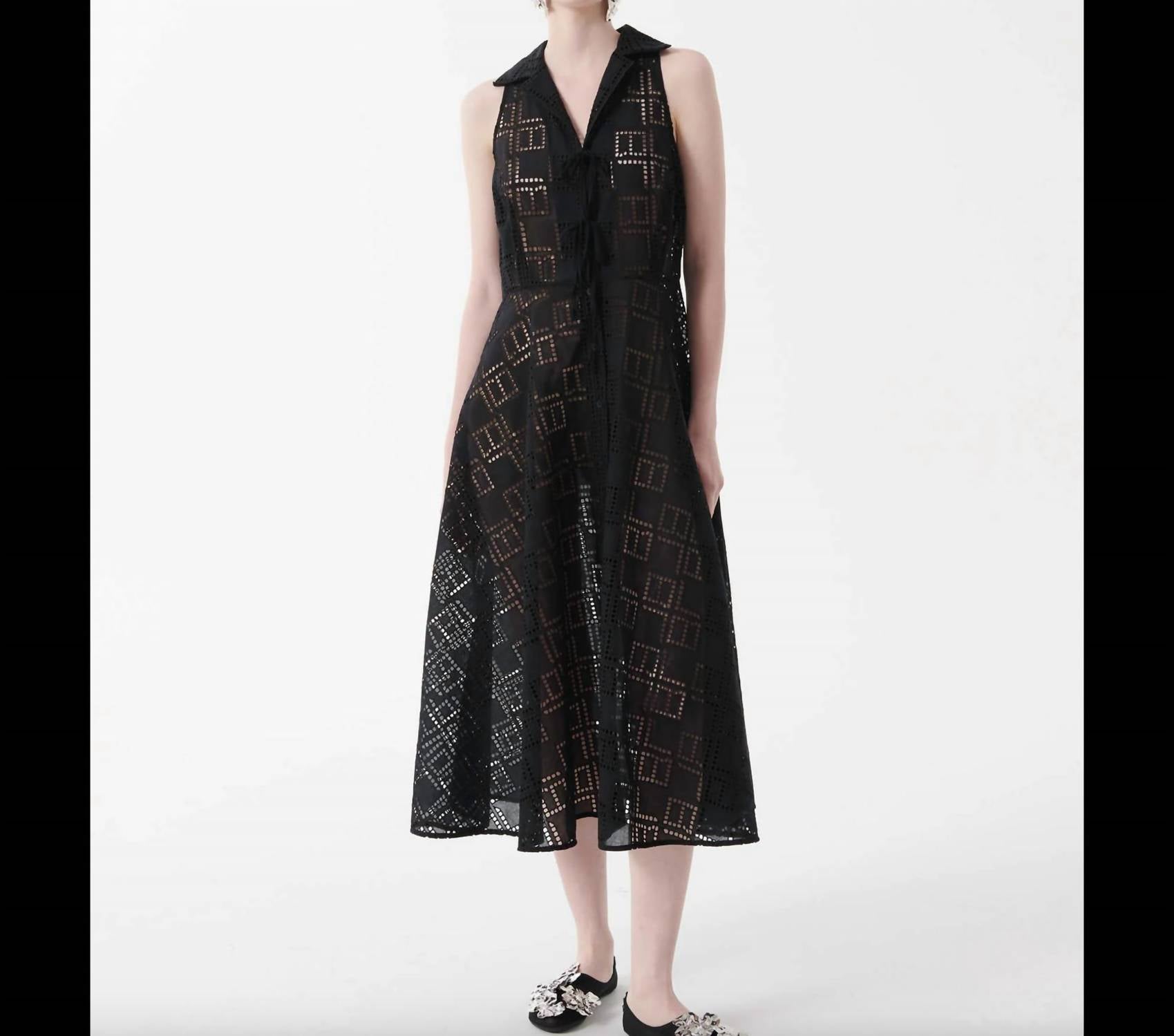Just add slides or mules and you are good to go. Introducing the Broderie Chemisier Midi Dress by Beatrice .b, a sleek addition to your evening wardrobe in elegant black. This sleeveless dress is crafted from Cotton Broderie Anglaise, showcasing a contemporary, three-dimensional pattern with a collar and lapel that leads to a button closure accented with laces. Made in Italy, this A-line silhouette combines luxury with a quiet sophistication, perfect for spring events or a Mother's Day celebration. Underslip included to complete your timeless look.