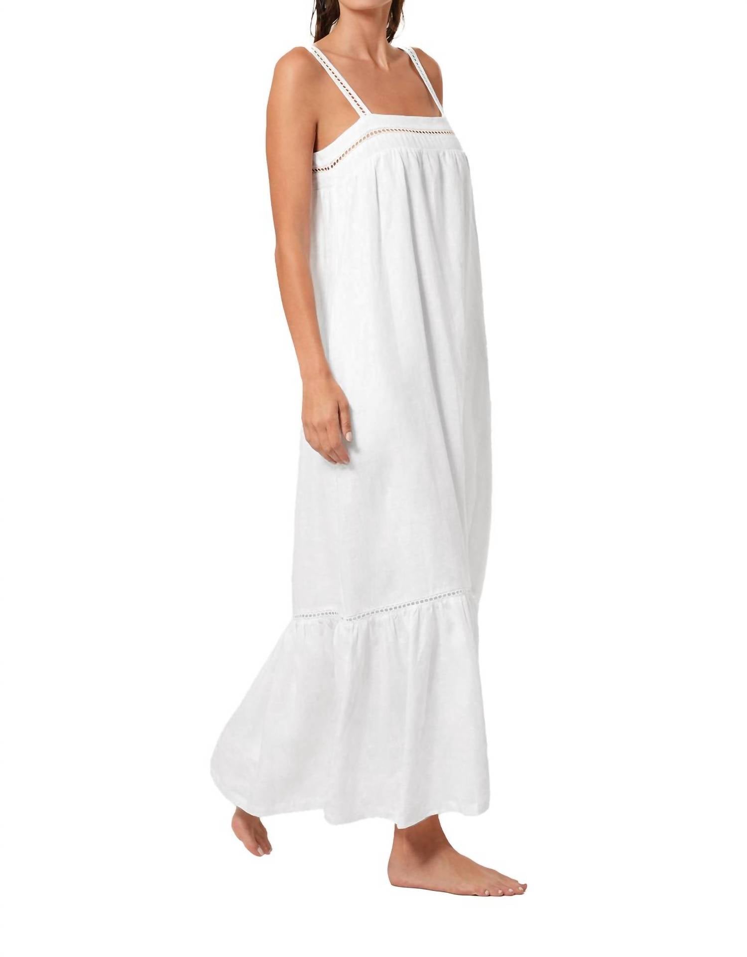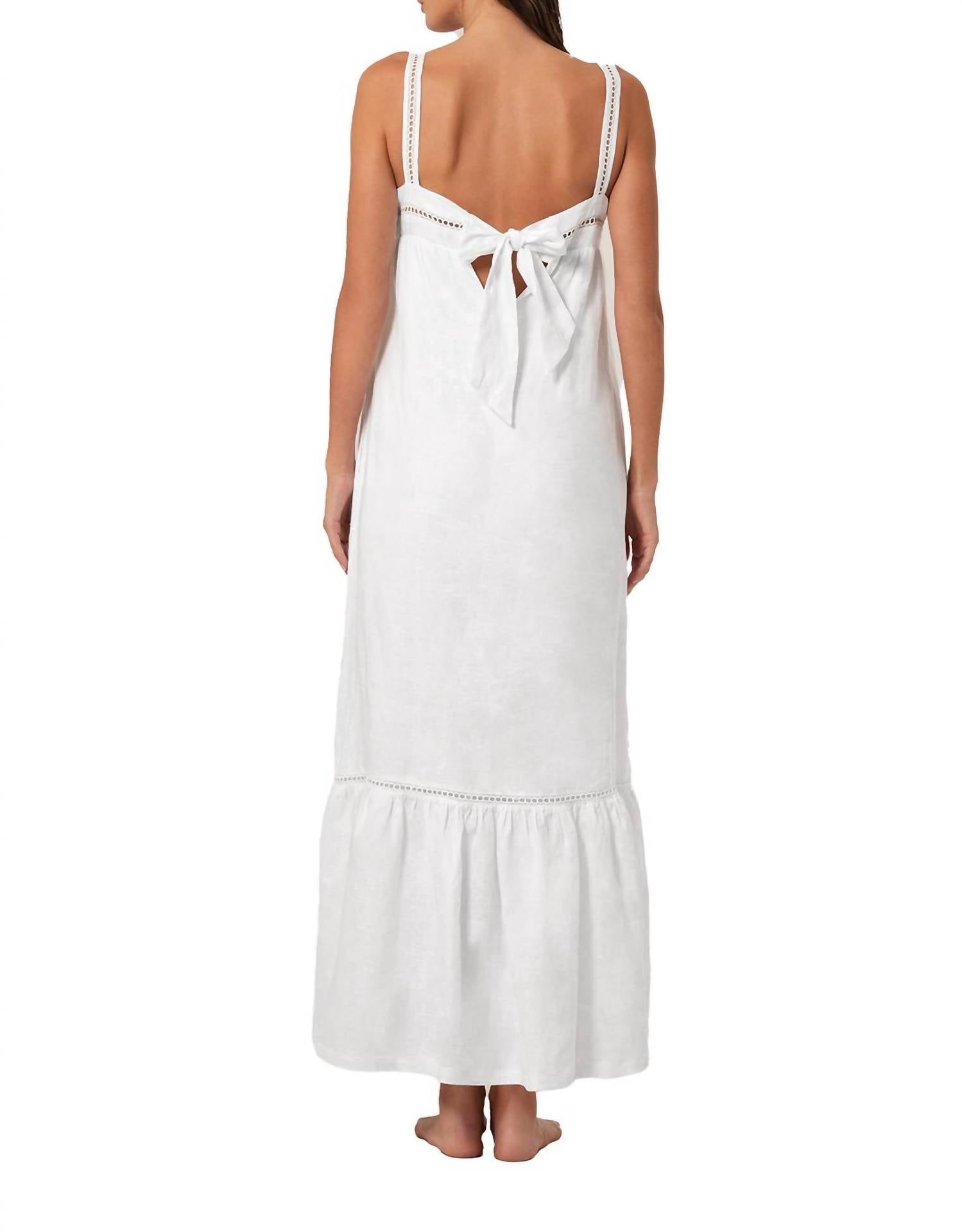 A maxi dress that is just as cute as it is comfortable. Discover the Aria Dress by Boamar, a sophisticated maxi dress in a minimalist ivory hue perfect for summer vacations. Made from 100% linen, this textured, shift silhouette features elegant spaghetti straps and a square neckline. Its tie closure effortlessly complements the airy, breathable fabric. Care instructions recommend hand washing to maintain its pristine quality.