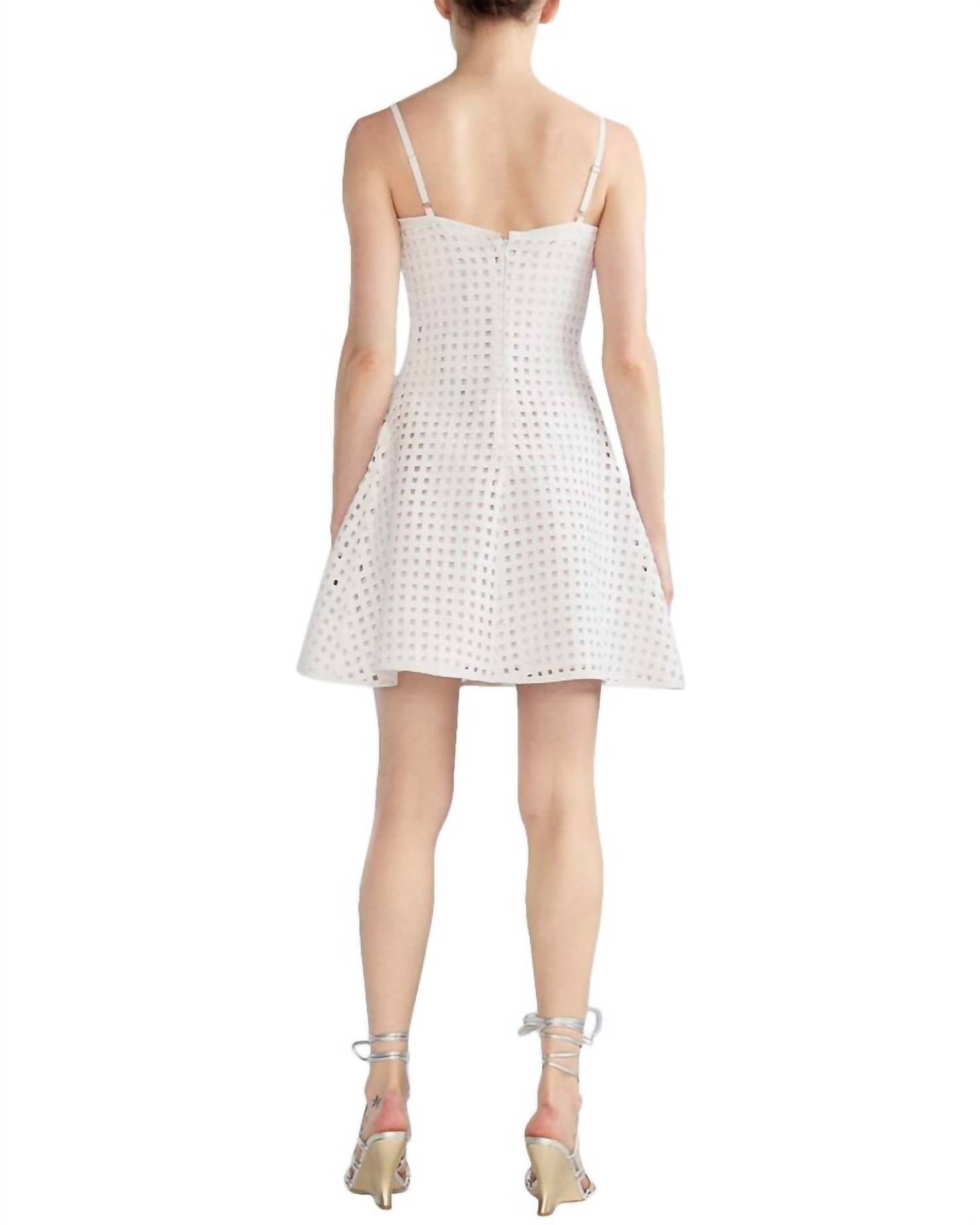 Presenting the Birdcage Linen Mini Dress by Cynthia Rowley, tailored for vibrant summer style in an elegant white. This dress boasts spaghetti straps and features a fit and flare silhouette with a length of approximately 24 inches from shoulder to hem. Crafted from 100% linen with an intricate geometric woven structure lattice design, it includes an innovative snap system for the removable lining. Designed for ease and elegance, the closure type is an invisible back zip, and it must be dry cleaned to maintain its pristine condition. Imported for superior quality and design.