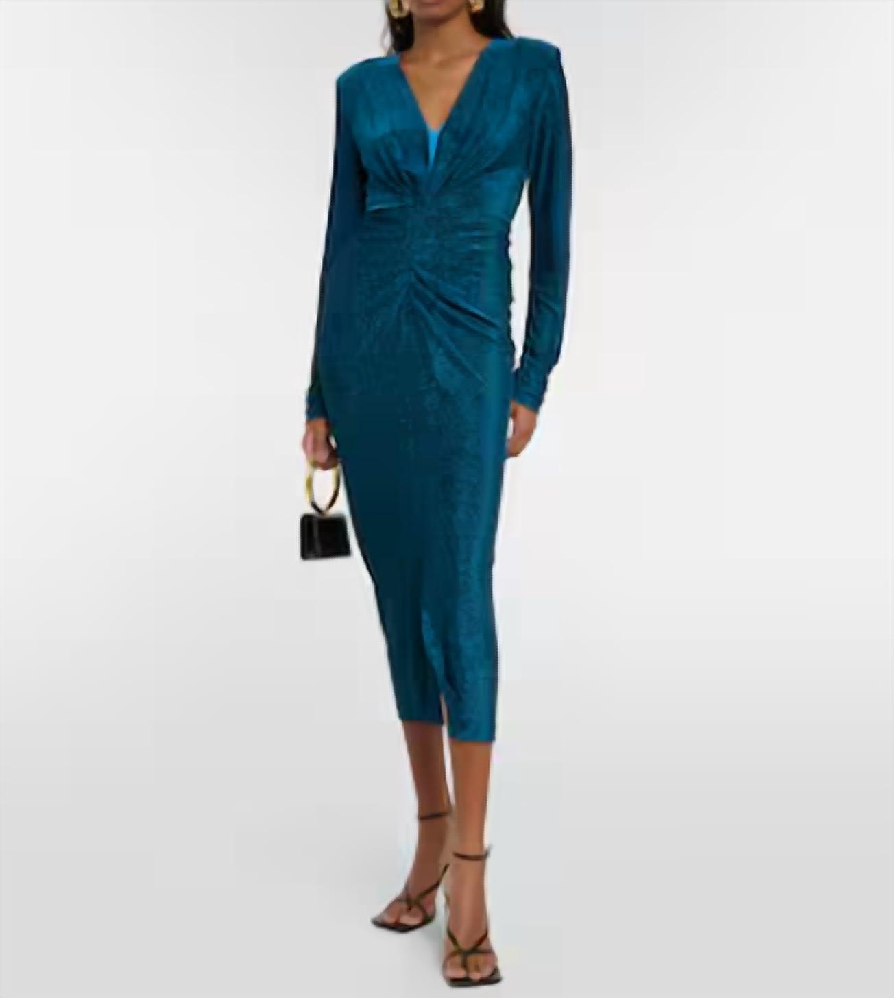 Um vestido midi tão versátil que suas opções de uso são infinitas. Apresentamos o Vestido Midi Hades Jersey com Brilho de Diane von Furstenberg, uma adição deslumbrante ao seu guarda-roupa para eventos noturnos. Este vestido justo apresenta uma cor azul sólida com um decote em V elegante e mangas compridas elegantes. Perfeito para ocasiões de primavera, combina sofisticação com brilho sutil. Observe que as instruções de cuidado não estão disponíveis para esta peça.