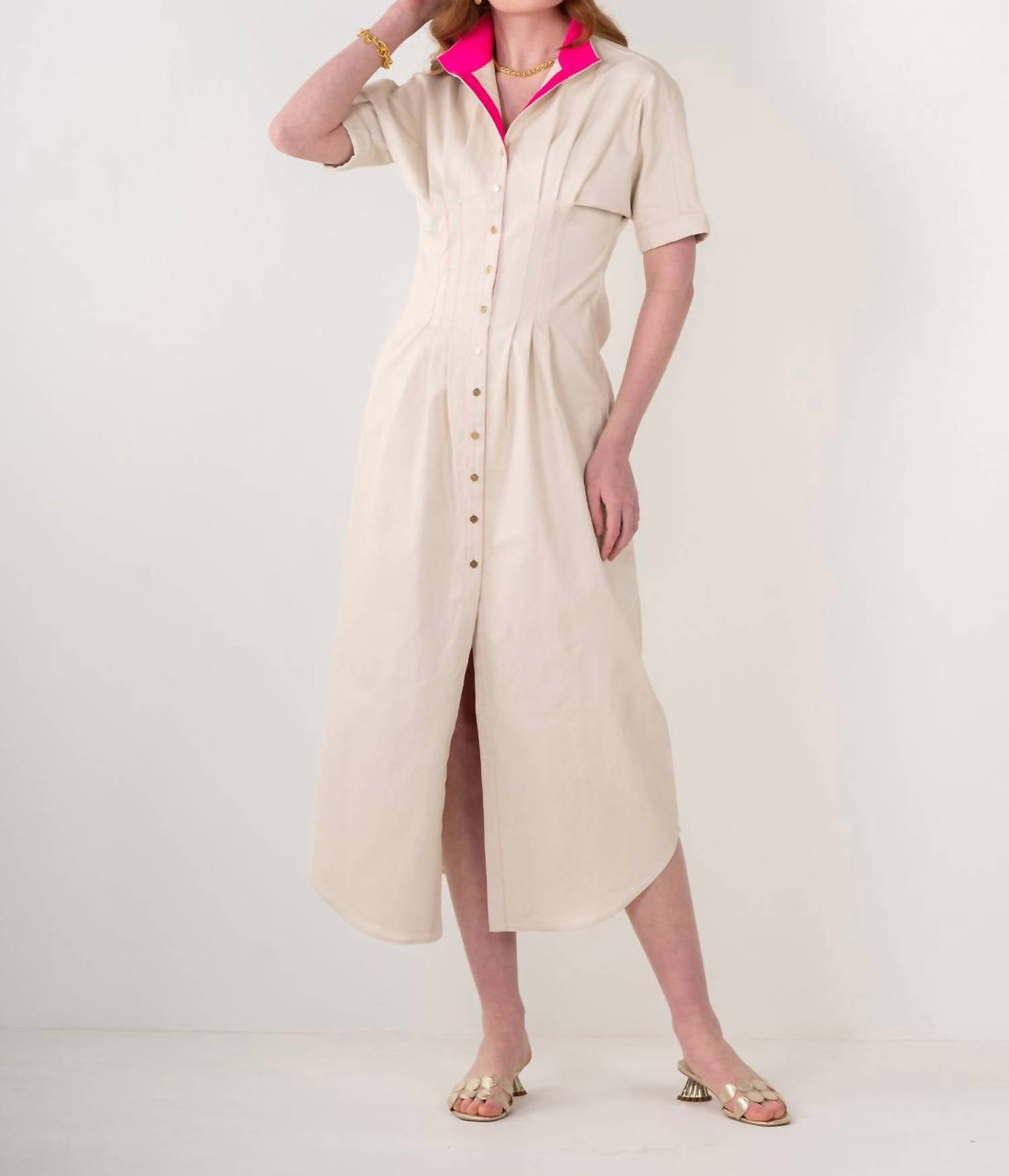 Combine este maxi com seu colar e sandálias favoritos para um look perfeito. Uma mistura perfeita de estrutura e estilo, este vestido midi sob medida é uma peça essencial para a primavera. Com uma silhueta elegante, mangas curtas estilo dolman e botões dourados exclusivos na frente, oferece elegância e conforto. A gola alta opcional adiciona um toque sutil, porém ousado. Confeccionado em uma mistura de 97% algodão e 3% elastano, com forro 100% poliéster, é versátil o suficiente para combinar com saltos ou com tênis. Cuidados: Lavar em ciclo delicado em água fria com sabão neutro; secar na vertical.