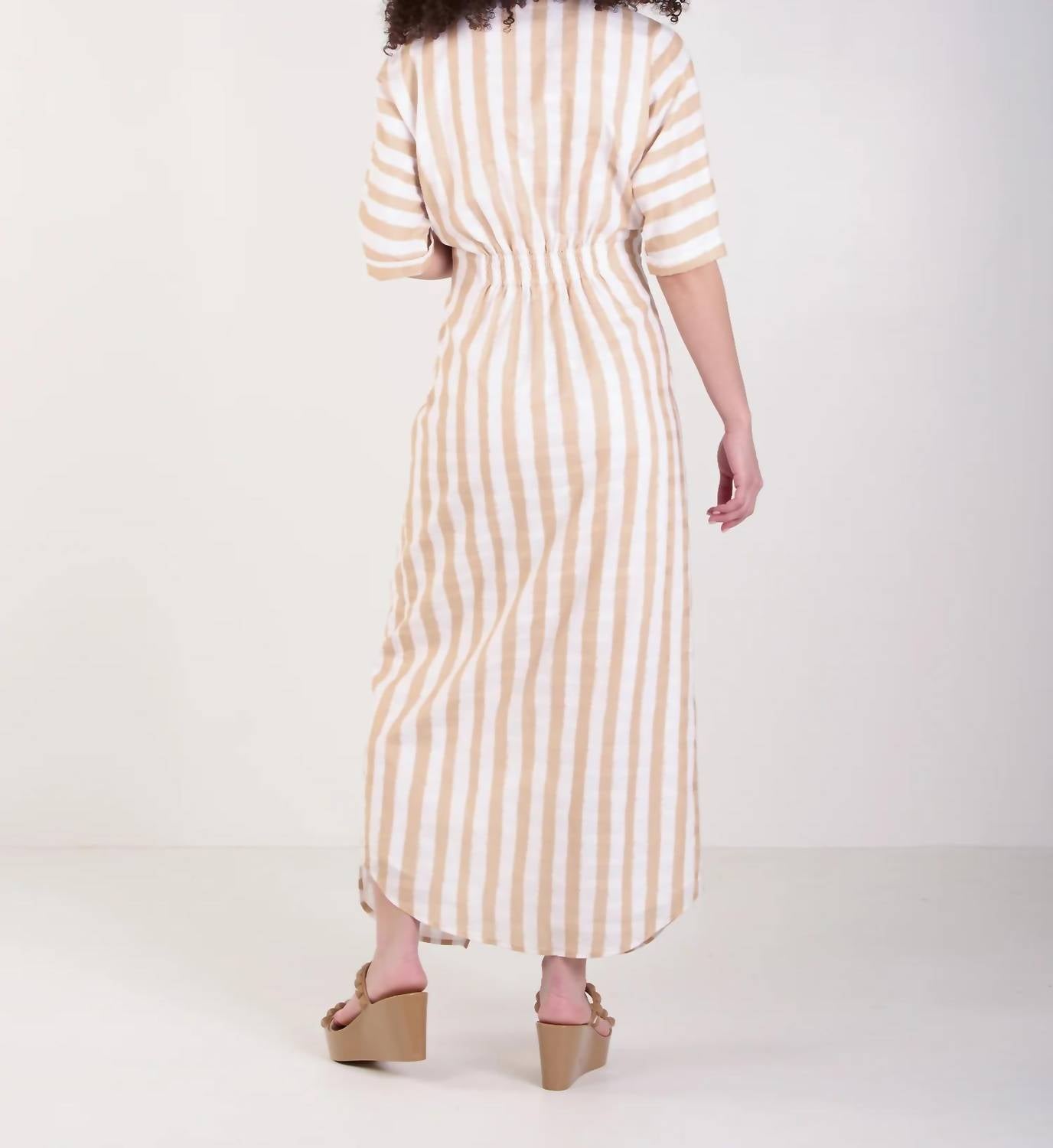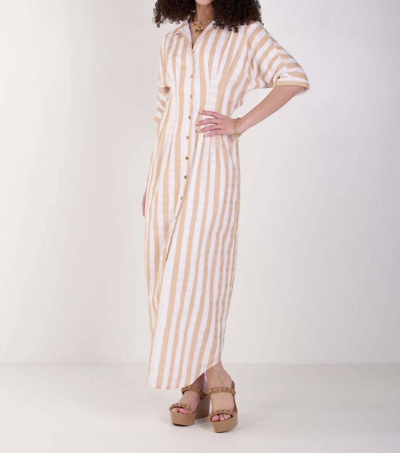 Who doesn't love a good maxi dress? This one you'll be reaching for season after season. The Georgia Dress in Sand Stripe is a timeless silhouette with modern ease. Crafted in lightweight, textured cotton jacquard, it features a flattering elastic back for a comfortable, contoured fit. Designed with a classic stand collar, short dolman sleeves, signature gold button closures, and a curved shirt tail hem, this dress blends polish with practicality. Whether styled up or worn casually, the Georgia Dress is your go-to for warm summer days and effortless, put-together outfitting. Details: Classic stand collar Short dolman sleeves Signature gold button front Tailored silhouette 100% Cotton Lining: 100% Polyester Delicate cycle wash with gentle liquid or powder detergent. Cold water will help preserve color & shape. Hang dry.