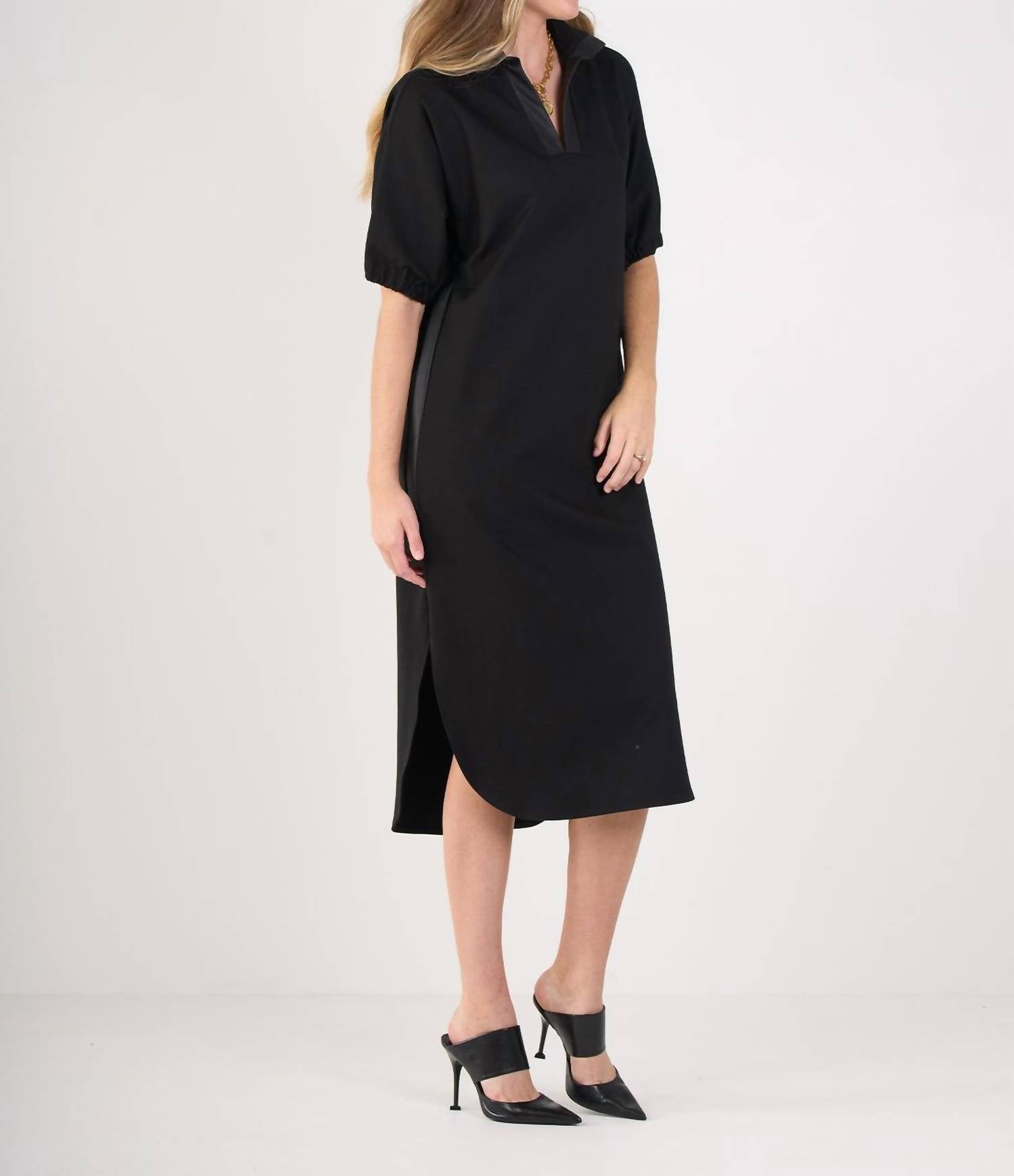 Just add slides or mules and you are good to go. Experience effortless elegance with Emily McCarthy's Poppy Caftan in Black Ponte, the quintessential piece for minimalist style. This midi-length dress features short dolman sleeves in a relaxed silhouette and a chic curved tail hem, perfect for transitioning from casual wear to cocktails. Made with supportive ponte fabric and adorned with vegan leather tuxedo stripe details, it boasts an optional stand collar and a notched neckline. Crafted without pockets and designed with a pull-on closure, this versatile caftan should be hand washed in cold water and line dried to maintain its color and shape. Ideal for spring holiday parties, it's a sophisticated choice for Thanksgiving celebrations.