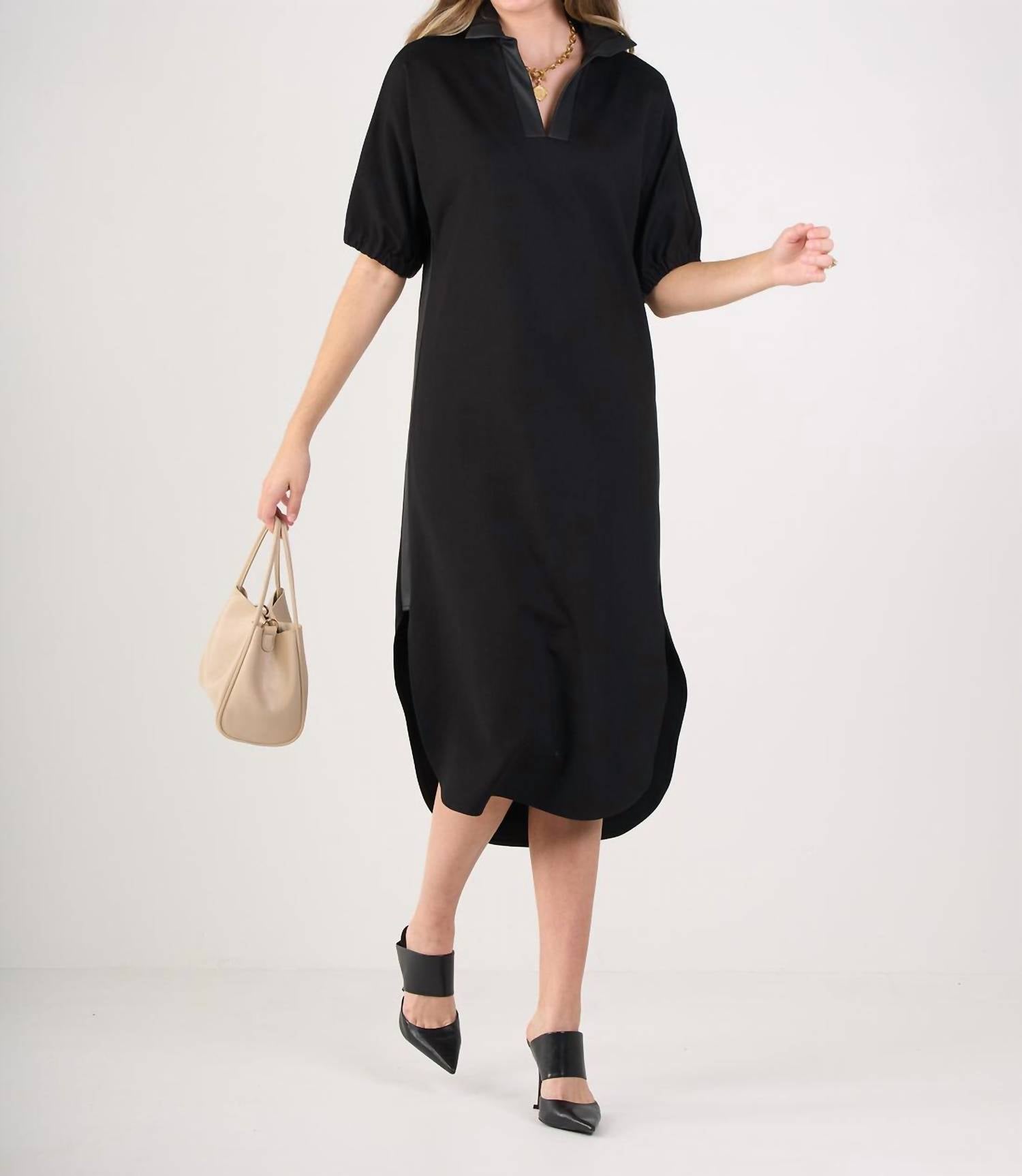Just add slides or mules and you are good to go. Experience effortless elegance with Emily McCarthy's Poppy Caftan in Black Ponte, the quintessential piece for minimalist style. This midi-length dress features short dolman sleeves in a relaxed silhouette and a chic curved tail hem, perfect for transitioning from casual wear to cocktails. Made with supportive ponte fabric and adorned with vegan leather tuxedo stripe details, it boasts an optional stand collar and a notched neckline. Crafted without pockets and designed with a pull-on closure, this versatile caftan should be hand washed in cold water and line dried to maintain its color and shape. Ideal for spring holiday parties, it's a sophisticated choice for Thanksgiving celebrations.