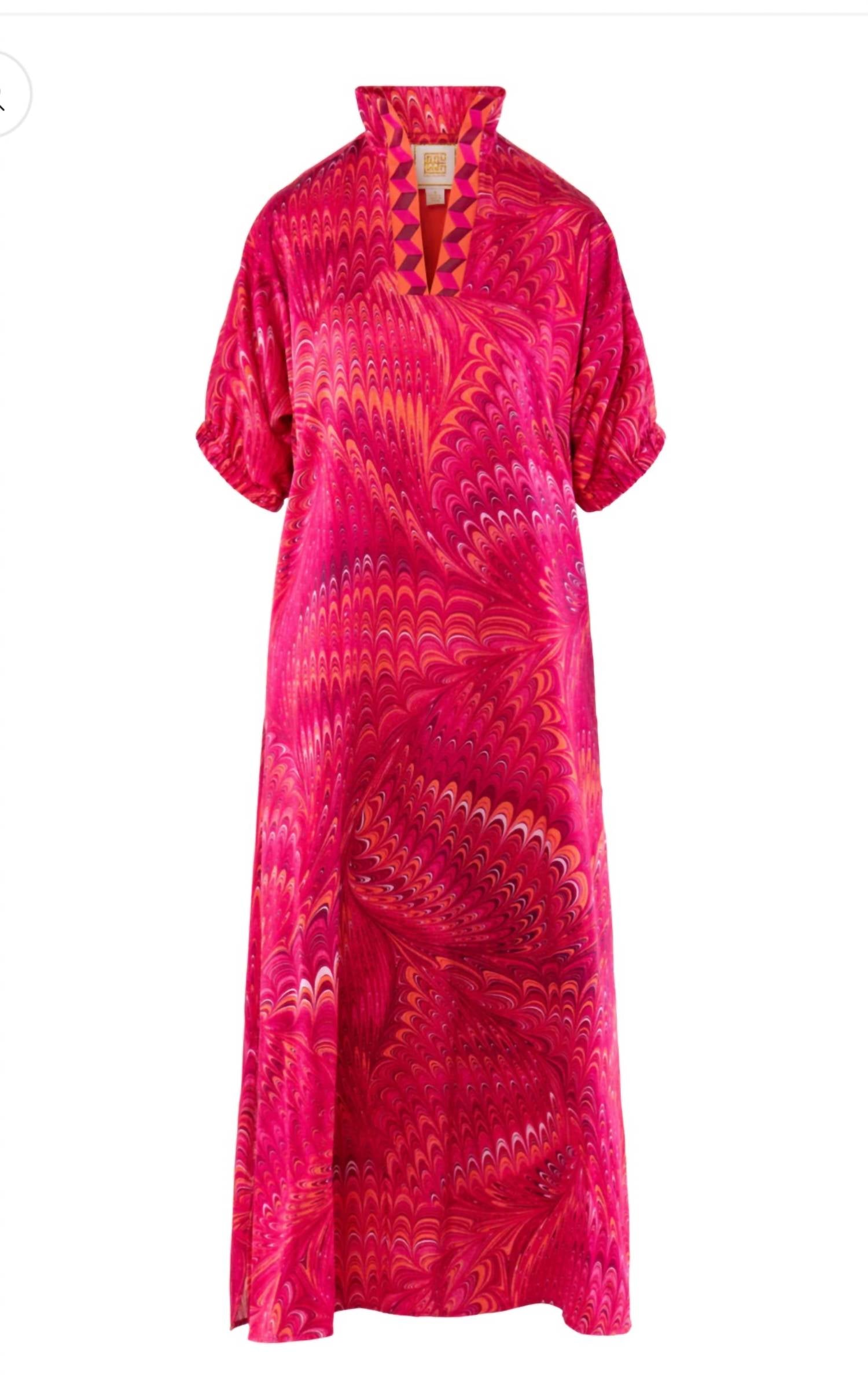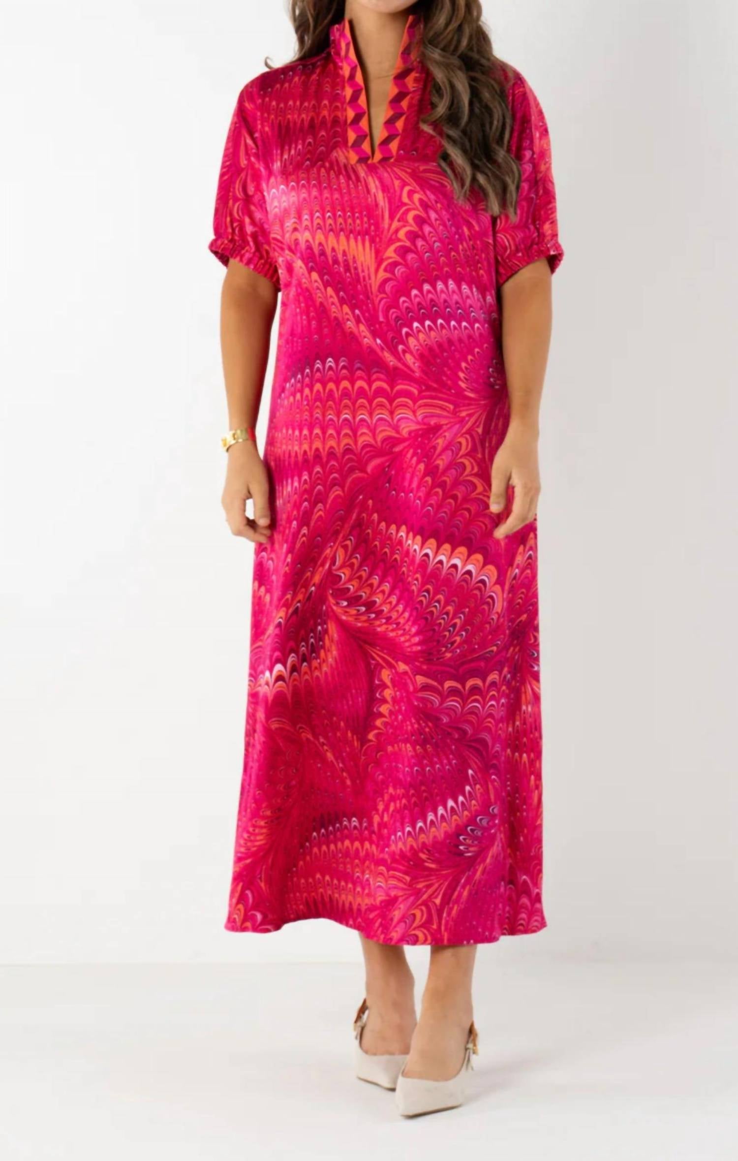 A midi dress so versatile, your options for wearing it are endless. Introducing the Women's Poppy Maxi Dress by Emily McCarthy in the eye-catching Venetian print. This dress boasts short, loose elastic dolman sleeves and a classic stand collar, offering a relaxed yet polished A-line silhouette. Crafted from 59% Silk and 41% Cotton, it features a 100% Polyester lining for added comfort. This dress is designed with a pull-on closure and includes side pockets, making it both stylish and practical. Perfect for a summer getaway, it requires hand washing with a gentle liquid or powder detergent and should be hang-dried to maintain its vibrant colors and shape. Model Jordan is 5'10" and wearing a size S.