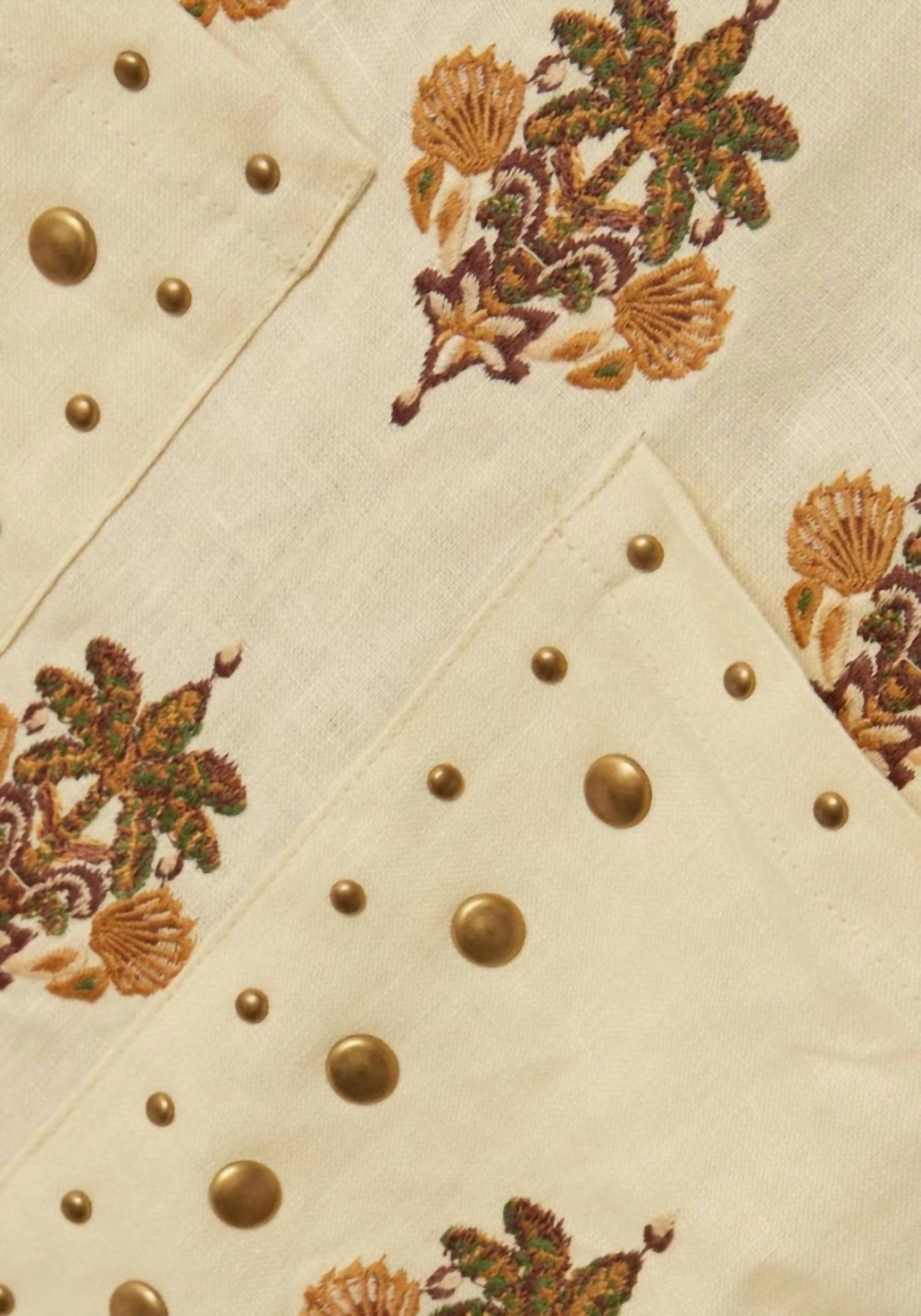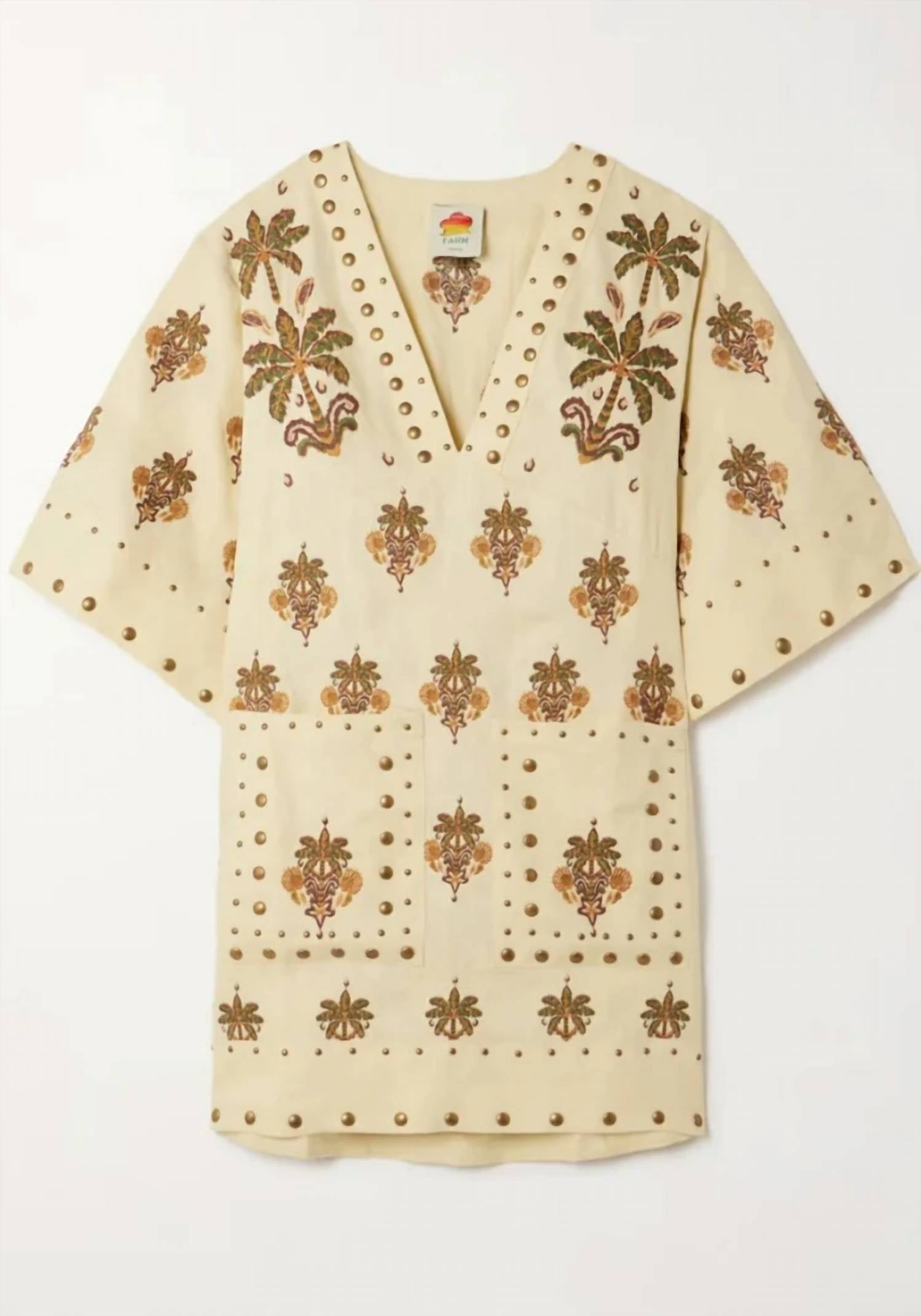 This dress is made of 100% linen and features embroidered coconut tree details with gold-tone stud accents. It has a tunic-inspired shape and a slightly loose fit. The fabric is mid-weight and non-stretch. Fits true to size.