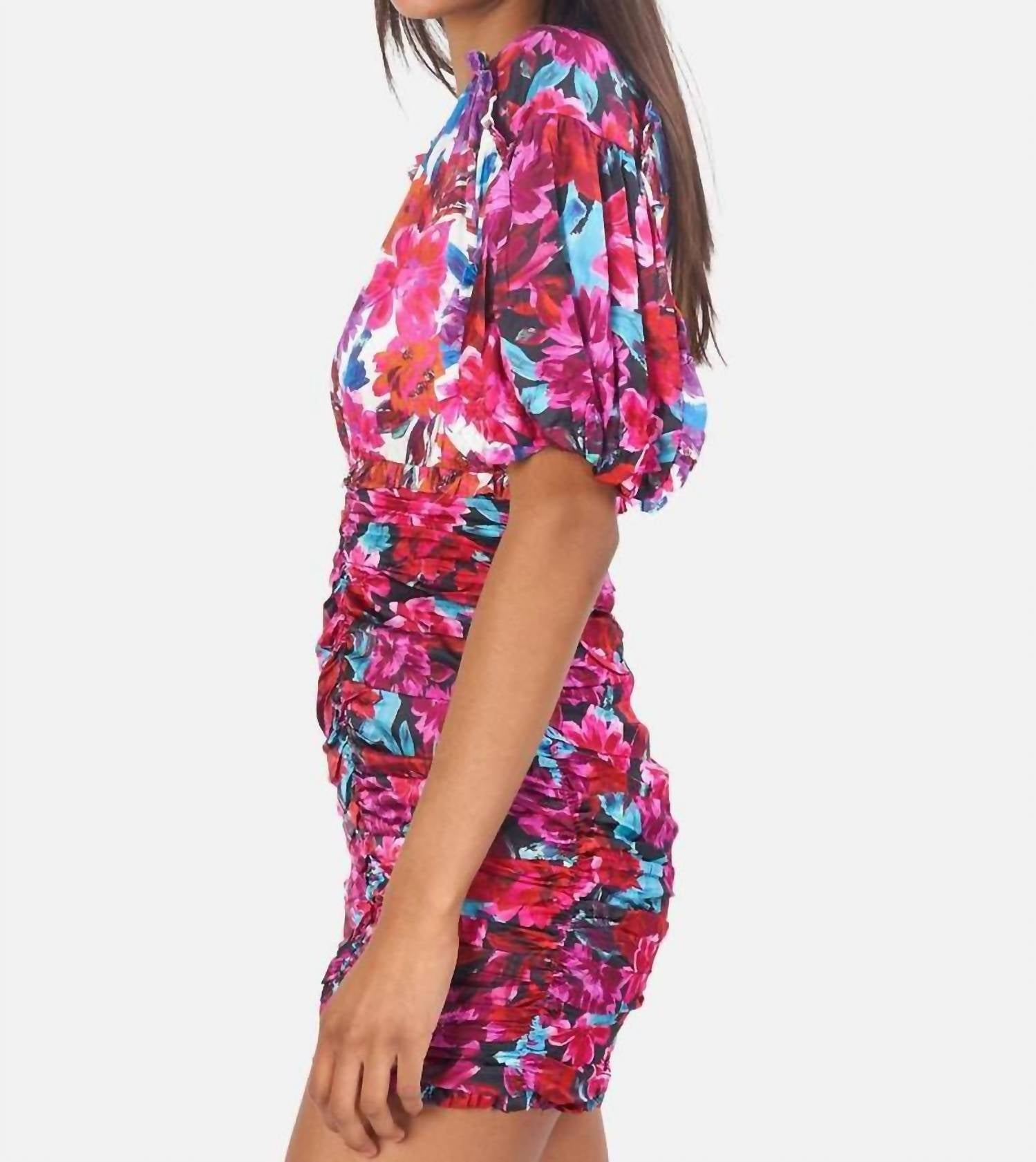 A short and breezy dress for those warmer days. Introducing the Cassandra Mini Dress by For Love & Lemons, a stunning pink sheath with a boho-chic floral pattern that's perfect for spring vacations. This mini dress features elbow-length sleeves and a chic V-neck, enhanced by pleating at the bust and ruching along the front, back, and sides. Crafted from a stretch fabric, the dress secures with a button closure and includes a charming tie closure at the back. Care for this elegant piece with dry cleaning to maintain its vibrant appeal.