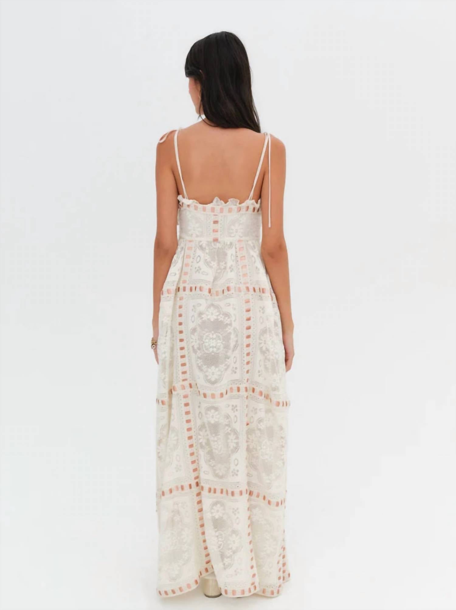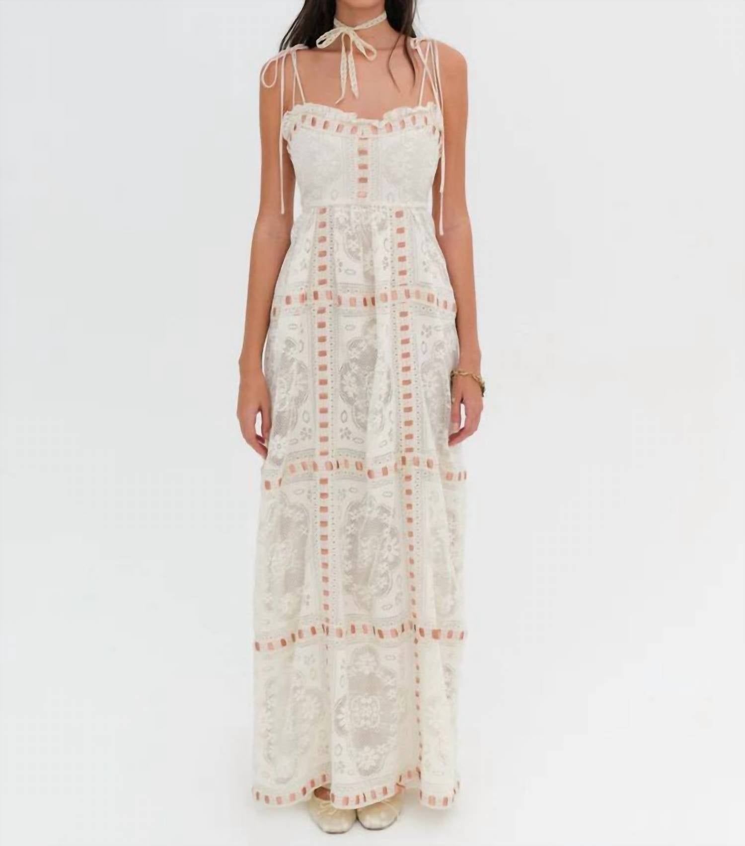 Abrace a elegância atemporal com o Vestido Longo Charlotte da For Love & Lemons, desenhado em um delicado tom creme. Este vestido longo feminino possui alças finas e é confeccionado em uma luxuosa mistura de algodão composta por 85% algodão e 15% nylon, complementado por um forro 100% poliéster reciclado. O romântico decote coração é realçado por uma saia franzida e renda siciliana intrincada com fitas de cetim trançadas. Para melhor conservação, recomenda-se a lavagem a seco em uma loja ecológica.