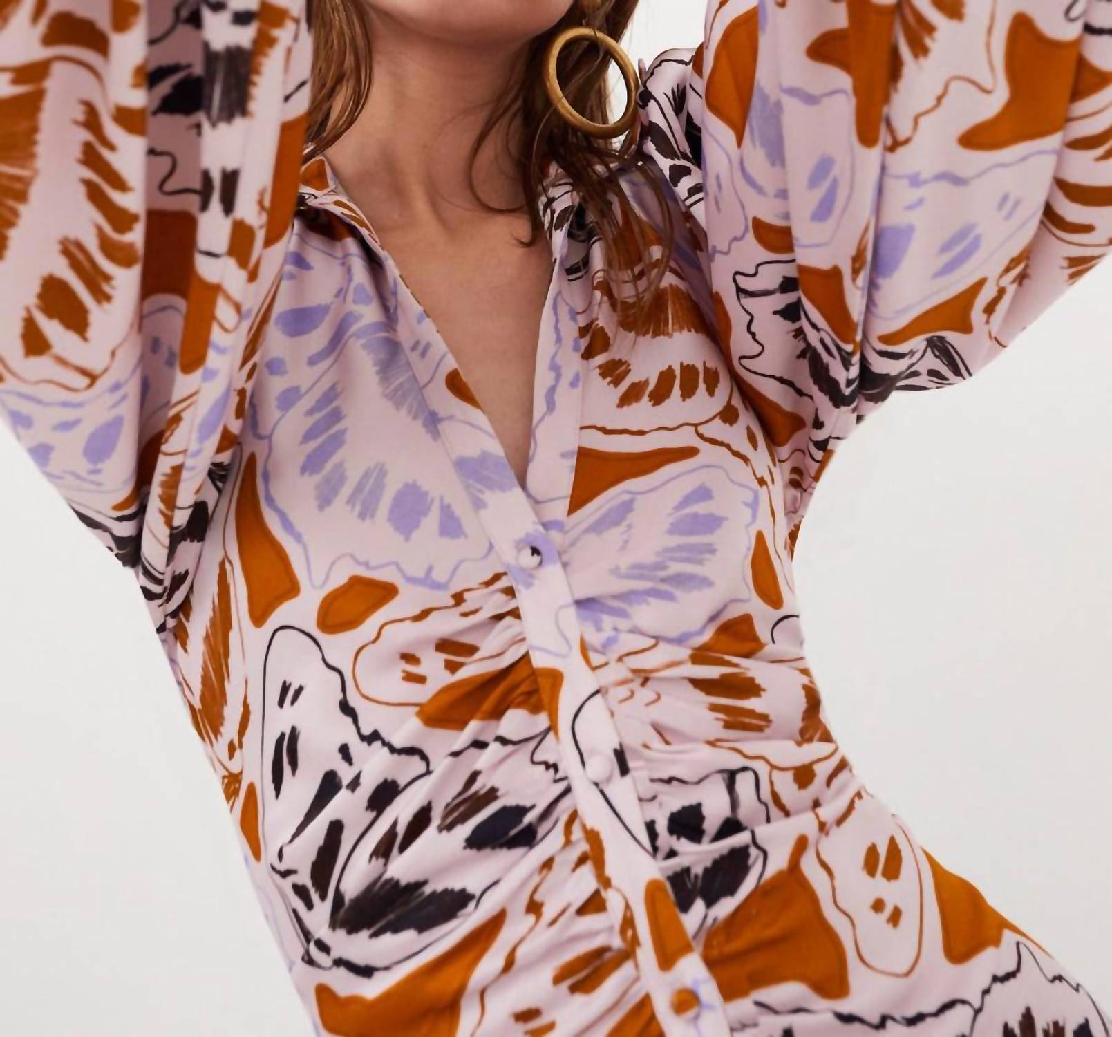 A short and breezy dress for those warmer days. Introducing the Esmeralda Mini Dress by For Love & Lemons, a boho chic piece perfect for vacation getaways and Thanksgiving gatherings. This orange shirt dress is crafted from a sustainable 50% EcoVero and 50% viscose blend and features a chic butterfly print. Long sleeves with Dorset button cuffs and gathering along the front placket add just the right amount of detail. Closure: Button closure. Care: Dry clean only.