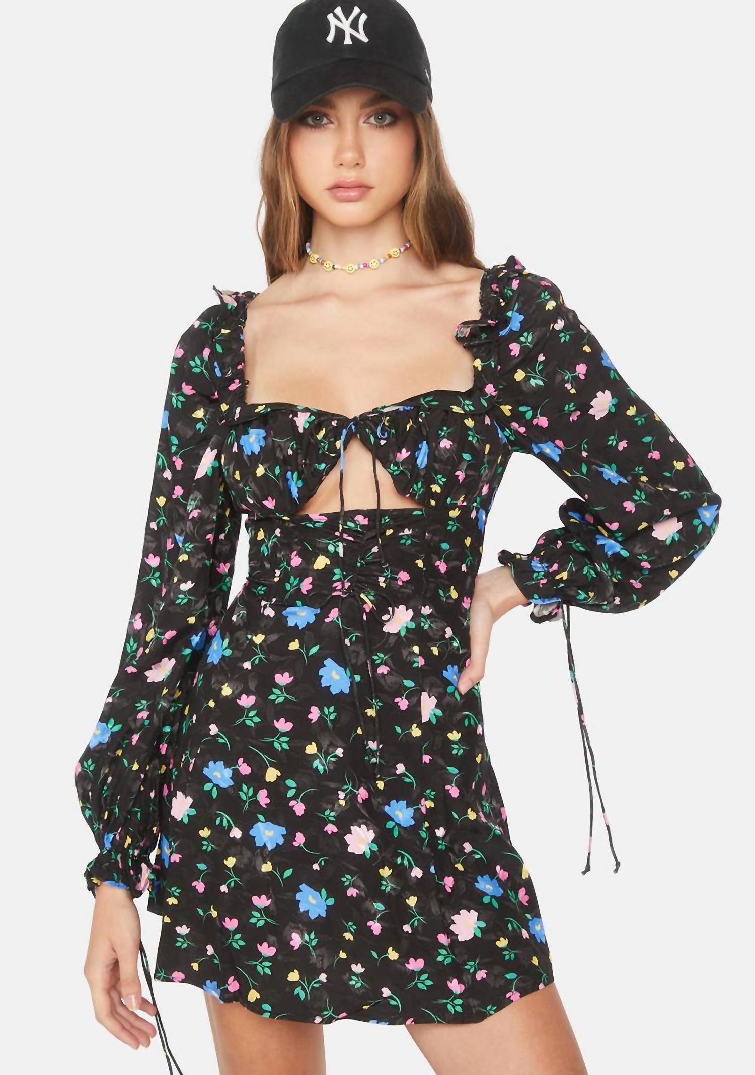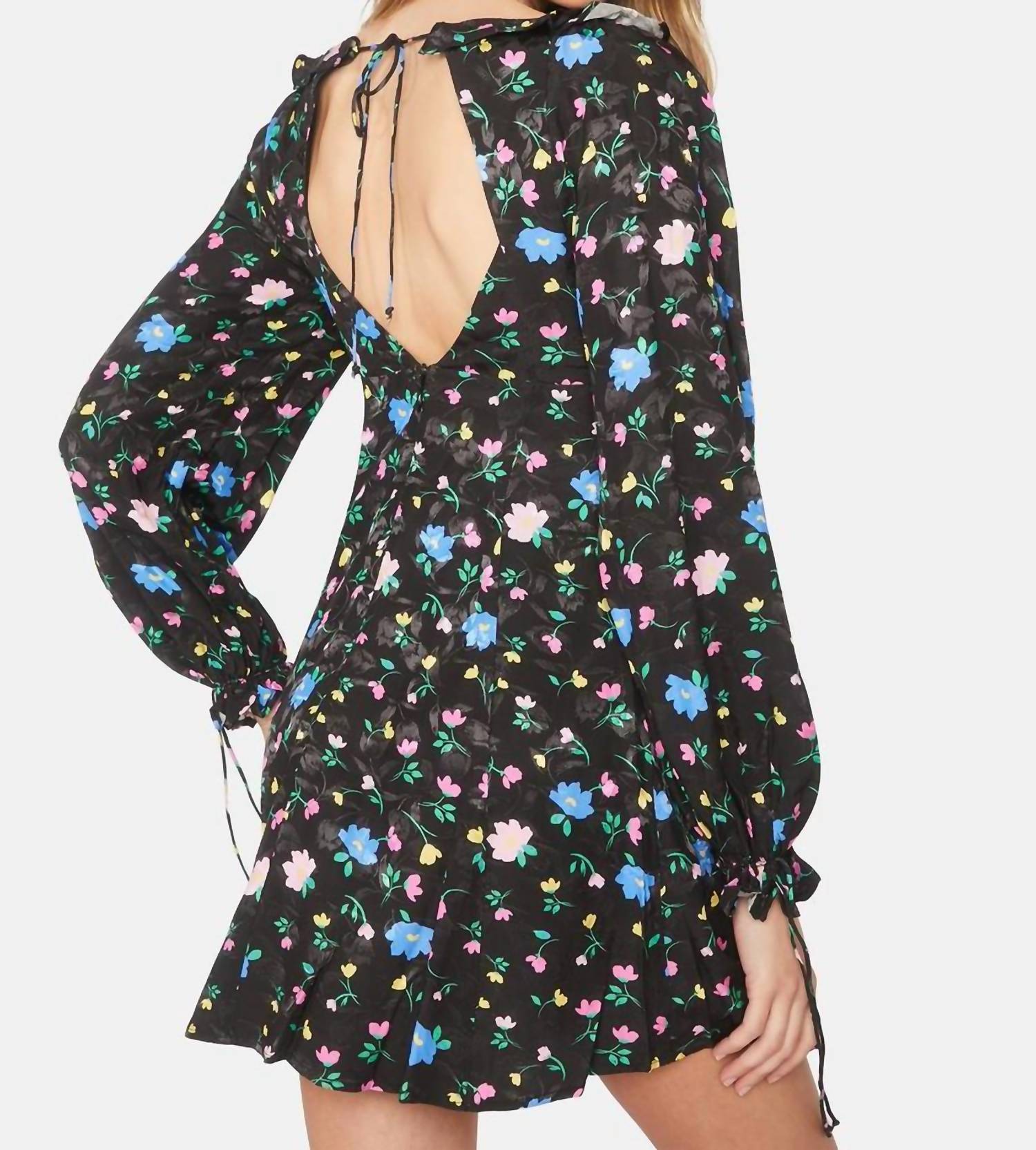 A short and breezy dress for those warmer days. Introducing the Lexy Mini Dress by For Love & Lemons, a chic addition to your spring wardrobe for a Thanksgiving engagement. This black mini dress, crafted from 65% Viscose, 35% Ecovero, features long blouson sleeves with elastic flounce cuffs and bow tie accents. Its ruched bodice showcases a cut-out detail and accent bows, while the back reveals a cut-out with a zip closure. Care for this floral boho chic A-line dress with dry cleaning to maintain its satin jacquard fabric and design integrity.