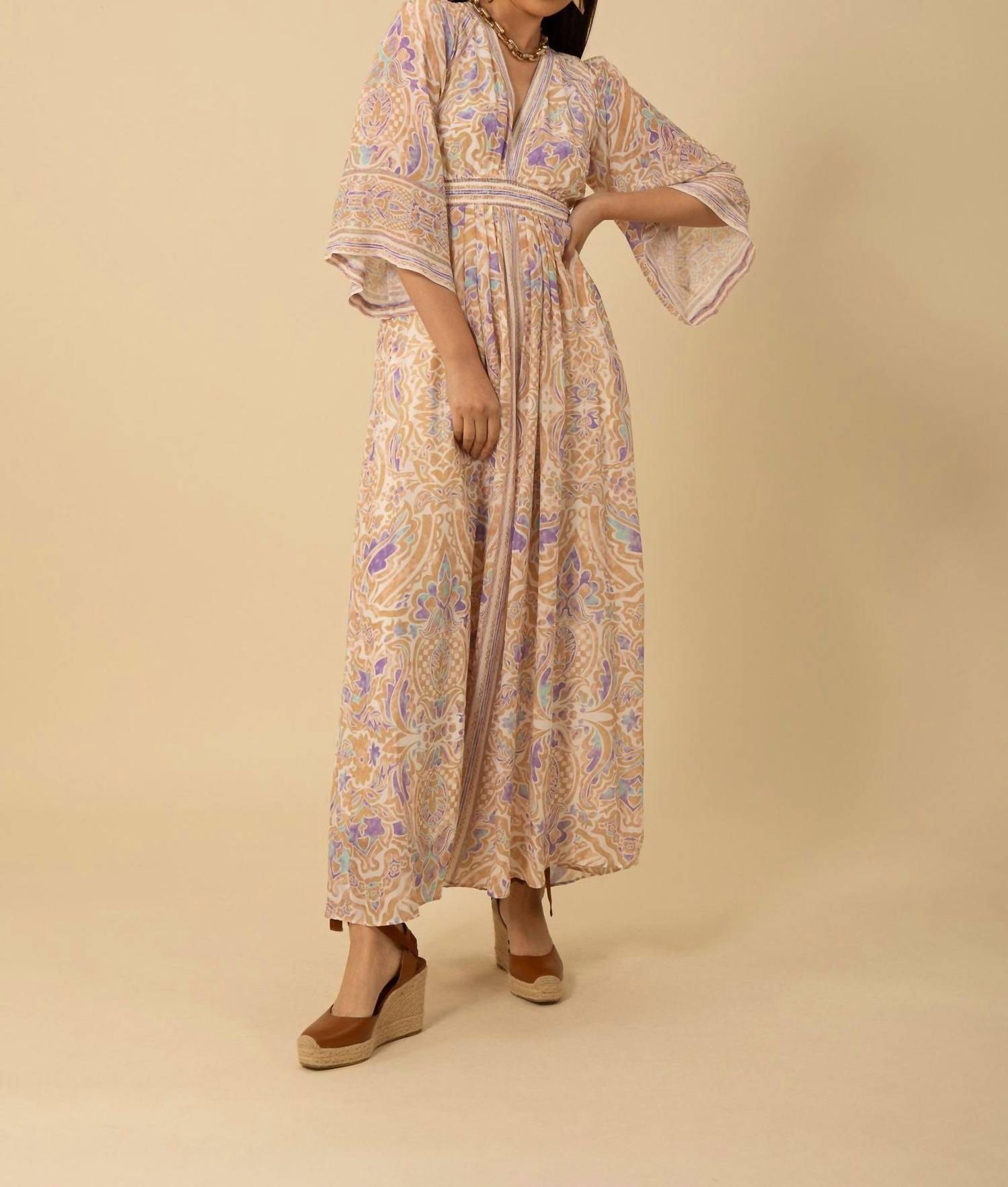 Combine este maxi com seu colar e sandálias favoritos para um look perfeito. Abrace o estilo boho chic com o Vestido Longo Abby da Hale Bob, com mangas sino três quartos e um decote em V deslumbrante. Este vestido bege estampado, em uma luxuosa mistura de 65% viscose e 35% seda, possui comprimento longo e corte em A, perfeito para qualquer ocasião de verão. Sua cintura franzida acentua lindamente a silhueta, complementada por bolsos práticos, enquanto o design fluido do vestido convida a um rolê. Cuide desta peça deslumbrante somente com lavagem a seco profissional.