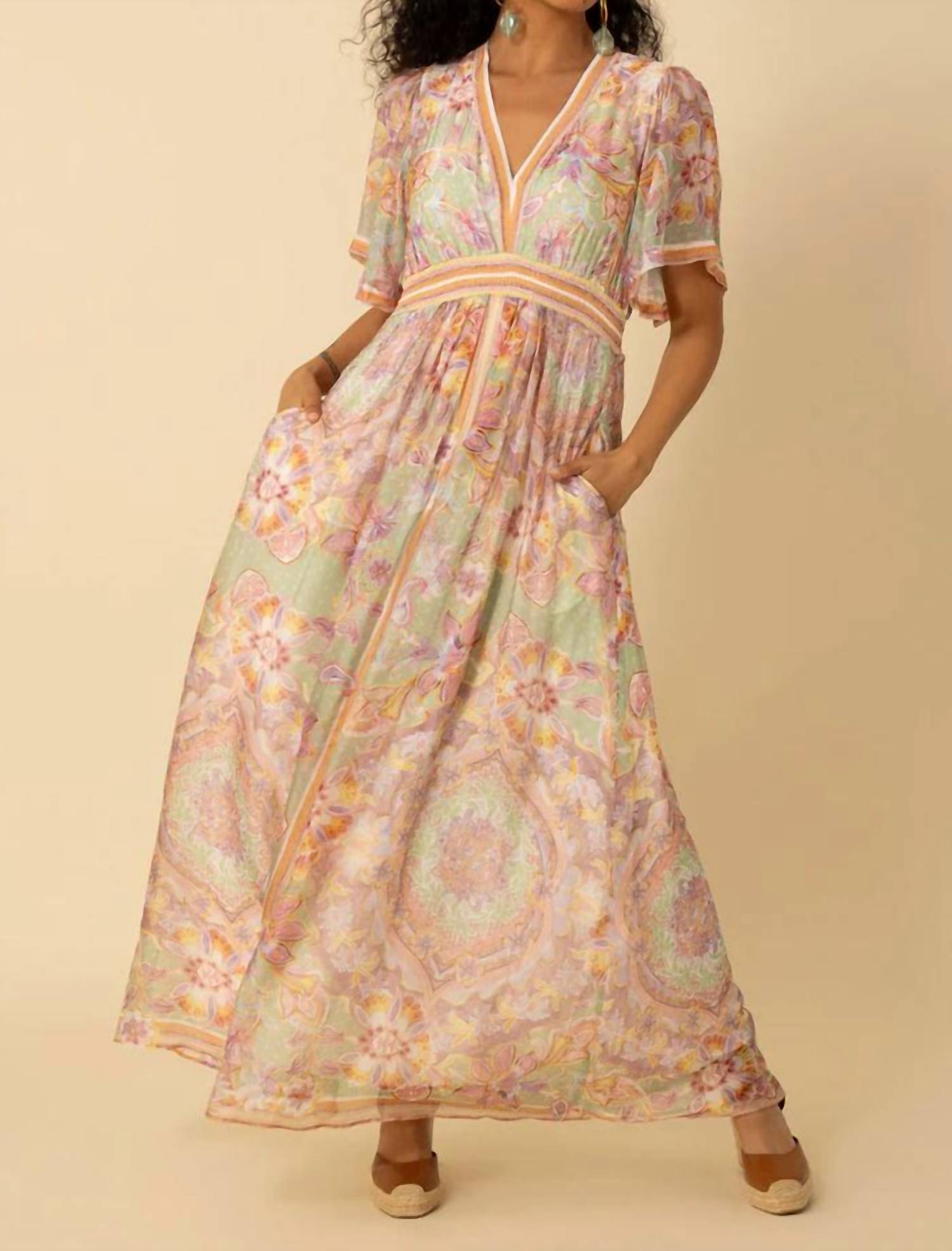 Um vestido longo que é tão fofo quanto confortável. Conheça o Vestido Maxi de Chiffon Jaliyah da Hale Bob, uma deliciosa mistura de estilo e conforto. Este vestido longo possui mangas curtas estilo sino e é confeccionado em 70% rayon e 30% seda, apresentando um toque macio com seu chiffon lavado. Com um cós franzido elegante e pregas elegantes na parte frontal, ele garante facilidade de movimento com um fecho de puxar. Completo com bolsos práticos nos quadris, este vestido pode ser lavado somente a seco, perfeito para ocasiões de verão.