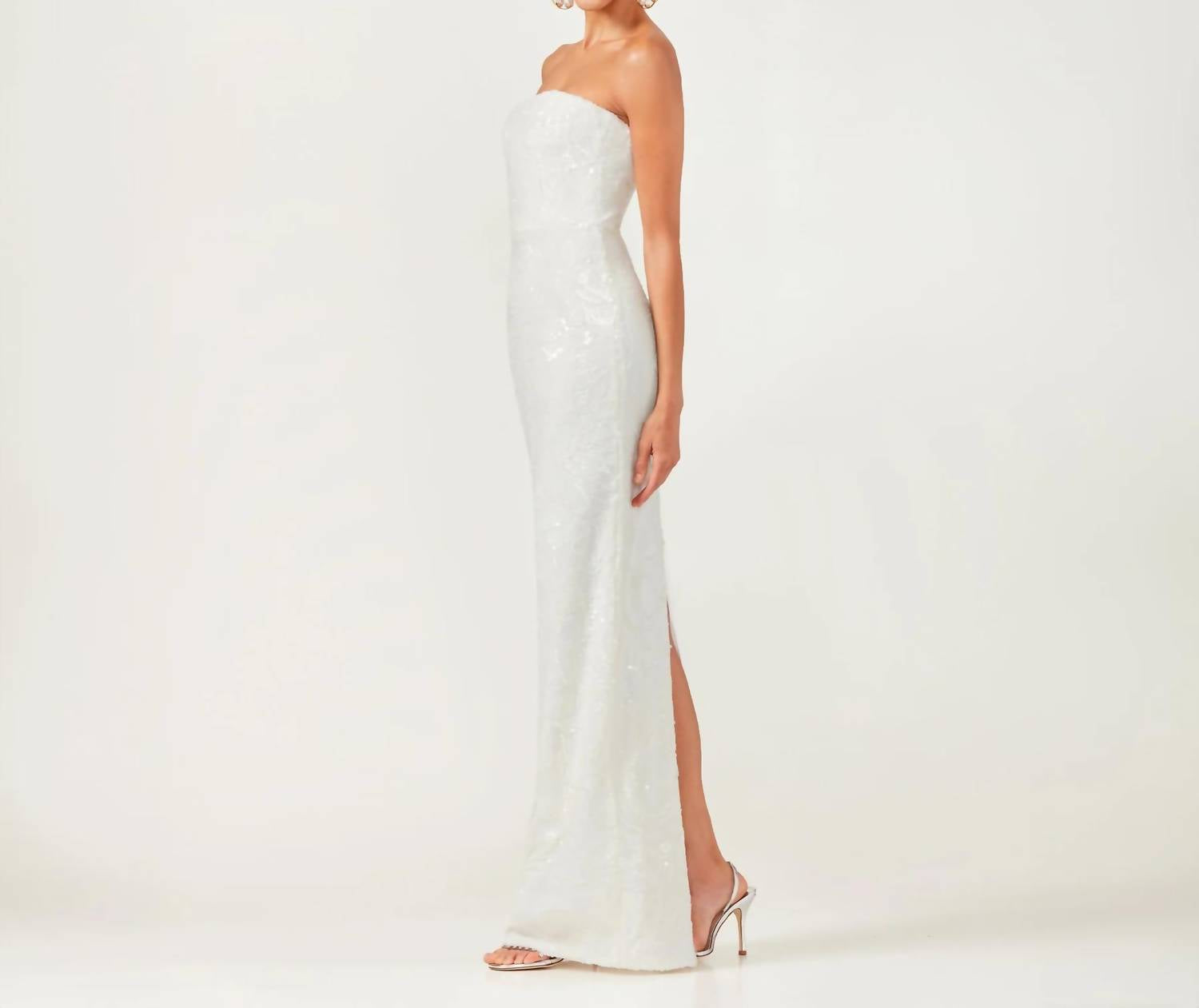 Introducing the Serena Strapless Sequin Long Gown by Helsi, where quiet luxury meets elegance in a stunning white hue. This strapless gown is crafted with sequin fabrication and offers a bodycon silhouette, featuring a structured stretch bodice with boning for enhanced comfort and support. With a shell made from 100% polyester, it measures 59 inches long from the shoulder, and includes a convenient center back zipper closure. Originating from the USA, the gown requires dry cleaning or can be hand washed cold inside out; lay flat to dry. Perfect for a sophisticated New Year's Eve or black-tie event.